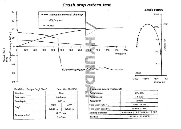 위 그림에서 458초에 역전기관이 작동했음에도 선박이 계속 좌회두를 한 것으로 나타난다. 이 이유는 458초동안 서서히 증가된 Turning Moment가 엄청나게 증가하여 후진에 의한 횡압력이 상대적으로 미약하여 계속 선회하는 방향으로 돌아간다. 이 선박은 304K이다.