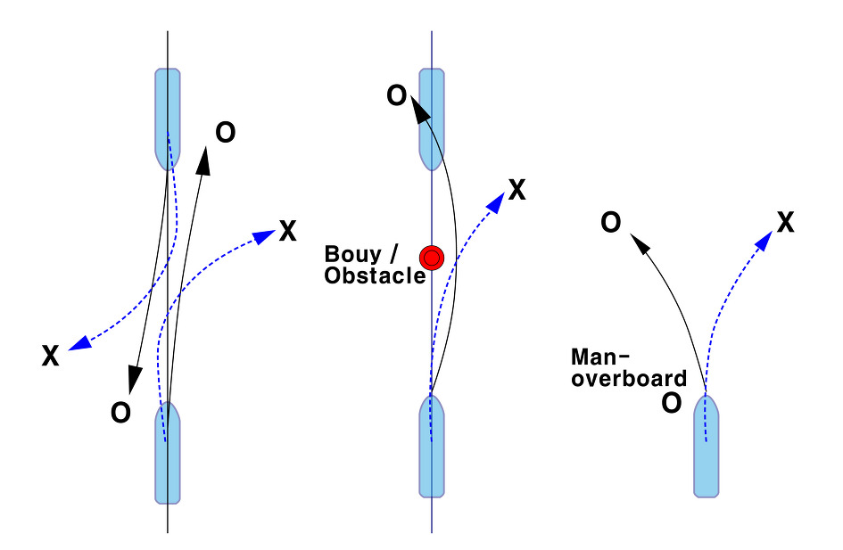 오른쪽) 항주 중 현외로 사람이 떨어졌을 때 즉시 낙하현측으로 전타하여 선미를 Kick시켜서 추진기에 말려 드는 것을 방지한다.
