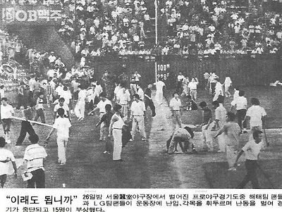 3-0 으로 앞서가던 LG가 7회말 7점을 추가, 승부가 완전히 기울어지자 해태의 8회초 공격 직전인 하오 9시12분께 3루측 관중들이 그라운드 안으로 밀려들기 시작, 군중심리에 휩싸여 순식간에 1천여명으로 불어나 외야펜스 광고부착물과 베이스를 뜯어내고 술판을 벌이고 불까지 지르는 추태를 벌였다. 이때 1루측 LG 관중 1명이 뛰어내려와 해태응원관중의 뒷머리를 철제의자로 내리치는 통에 양측 관중 사이에 패싸움이 벌어졌다.