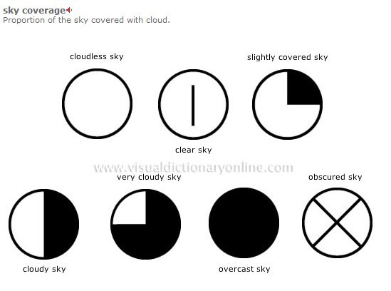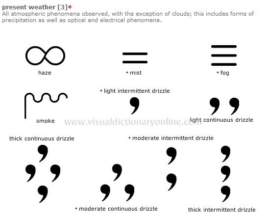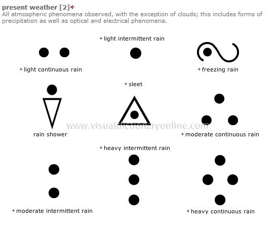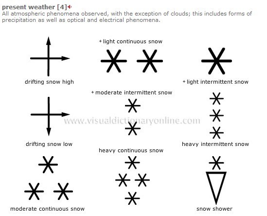 기상도에 사용되는 기호의 사용 예는 다음과 같다..
