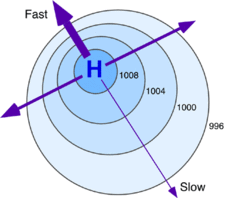 풍속은 등압선의 간격으로 보이는 것처럼 날씨체계내의 기압차 또는 기압 경도와 직접적으로 관계되는데 좁은 간격의 등압선은 강한 경도를 표시하고 강한 바람을 나타내며 넓은 간격은 약한 기압경도와 약한 바람을 나타낸다. 등압선의 간격과 위도를 사용하여 합리적이고 정확한 풍속을 Geostropic 또는 Earth driven, scale로부터 계산할 수 있다.