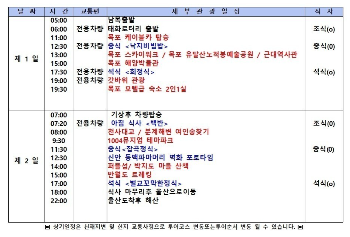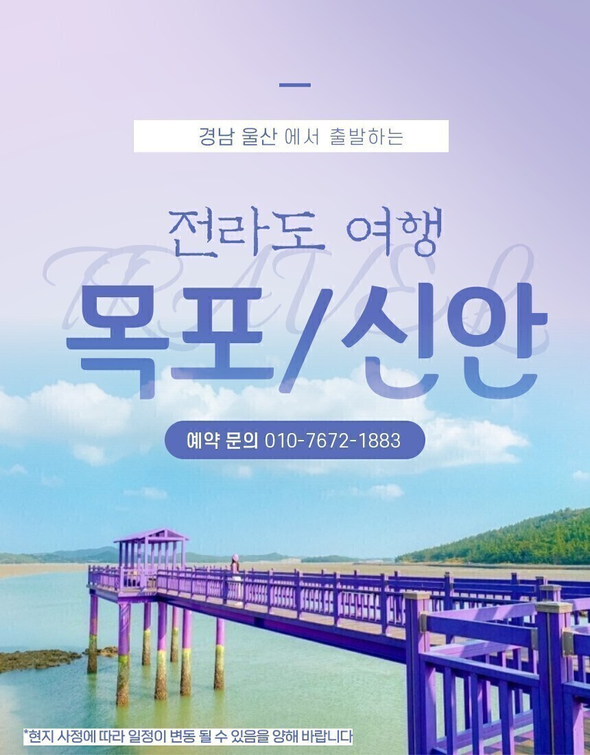 울산/경주 출발 남도 맛 여행 - 목포 신안 천사대교 퍼플섬 꽉찬 1박2일 여행! 부모님선물 효도관광 노팁 노옵션 노쇼핑! 프리미엄 패키지여행! 상품가 [4인1실 기준] 279,000원 [3인1실 기준] 289,000원 [2인1실 기준] 299,000원 운영특성상 닉네임으로 선입금부탁드립니다 ^^ 입금계좌 : 우리은행 010-8580-7677 예금주:남시현 여행사제공 :모텔급숙소, 1박6식[특식3회] ,관광지입장료,차량비 불포함 : 여행자보험,개인경비 여행 준비물 https://blog.naver.com/hyeon1883/223141524901 전용차량 탑승경로 남목경남은행맞은편 05:00-현대백화점앞 05:05 - 우체국 - 05:08 일산해수욕장 05:10 -등대사거리05:12 - 문현관 05:15 - 염포동 05:20-양정동 05:25 -메가마트 05:35 - 동천 05:40-학성공원 05:45- 태화로타리 06:00 -신복로타리 06:10 ▼▽전용차량 탑승위치 확인하기▼▽ https://blog.naver.com/hyeon1883/223141576465 예약문의 전화&문자 상담 010-6284-1883 카카오톡상담 https://pf.kakao.com/_nHjMxl 특전 특식 3회 -회정식 -잡곡정식 -벌교꼬막한정식 ▶ 밴드로 일정 받아보기 ◀ 울산트레킹클럽 밴드가입하기 https://band.us/@ulsantrekking 푸른산악회 밴드 가입하기 https://band.us/band/55309270 울산출발 테마여행 밴드 가입하기 https://band.us/@dptour <국내/해외여행땡처리특가모음> 돌고래여행사 밴드가입하기 https://band.us/@dolphintour ▶ 중요 공지 ◀ https://cafe.naver.com/dolphintour/1402 자주하는질문 1. 예약하고싶은데 어디로 연락해야하나요? - 본 카페에 댓글로 남겨주시거나 / 010-6284-1883로 전화또는 문자부탁드립니다 - 문자로 예약시 닉네임<성함> 탑승장소 인원수 작성하여 보내주시면 감사하겠습니다 ^^ 2.신청후 바로 입금해야하나요 ? -네 최근 노쇼고객님들이 많아서 선입금 받고있습니다 자세한 안내는 중요공지참고바랍니다 - 입금시 닉네임으로 입금해주시거나 / 입금후 문자주시면 체킹 하겠습니다! 3.좌석은 지정이 가능한가요 ? -네 좌석 지정가능합니다 다만 선착순이라 늦게예약하시면 원하시는좌석이 없을수있습니다 4.카페 회원만 참석가능한가요 ? -저희는 비 회원제이기에 남녀노소 누구나 참석가능합니다 5. 차량번호랑 탑승시간은 따로 안내해주나요 ? -출발하는 주 수요일 예약하신 대표자님께만 출발확정문자 보내드립니다 차량번호 / 기사님연락처 / 탑승지별 시간 / 입금계좌 / 준비물등 <단 인원미달시 취소될수있습니다> 6.예약후 취소시에는 어떻게되나요 ? -출발일 기준 3일 이전 취소신청시 전액 환불 -출발일 기준 3일 이내 취소시 이용쿠폰으로 지급 -출발일 당일 노쇼 환불불가 7.기타문의는 어디로 하면되나요 ? 산행코스관련문의 이대장 010-3790-3539 예약관련문의 국내담당 010-6284-1883 차량관련문의 황성호기사님 010-4579-1260 예약절차및 안내문 >예약방법은 카페에 댓글을 남기시거나, 010-9408-1881 문자또는 전화 ,돌고래여행사 카카오톡으로 연락주시면 됩니다 ^^ >천재지변이나 최소인원(20명) 모객 미달시 행사가 취소될수 있습니다.<모객 미달시 전액환불> 행사가 취소될 경우 출발일 기준 최소 1~2일전에 연락을드립니다. 출발확정 되었던 상품이라도 입금이 20명이 되지 않을 경우 여행이 취소 될수도 있습니다. >모든 연락은 휴대폰으로 안내되므로 예약시 정확한 휴대폰번호를 남겨주세요! . 연락처가 잘못 기재되어 발생되는 일은 책임지지 않습니다. >본 여행상품은 예약순서와 관계없이 선착순 입금에 의해 좌석이 마감될수있음을 양해바랍니다. >고객님의 안전을 위하여 가이드가 공지하는 안내사항 및 안전수칙을 반드시 지켜주세요. 특히, 이용자 본인의 과실 및 본인 건강상태, 과도한 음주로 인하여 발생한 사고는 책임지지 않습니다. >우천시에도 행사는 진행이 됩니다.(단 , 현지에 기상악화등으로 인하여 진행불가시 대체코스로 진행됩니다 . #섬지역 여행또는 케이블카 등등) >전용 차량내 흡연, 또는 과도한 음주로 인해 고성방가등 타인에게 피해를주는 행위를 할경우 , 가이드의 저지의 불응시 강제하차됩니다 환불 취소 안내 >여행경비는 출발일 기준 1일전까지 전액결제 하셔야됩니다. 지정일까지 여행경비 미입금시에는 자동으로 예약이 취소됩니다. >예약변경/연기는 출발일 기준 3일전 15시까지 신청하셔야하며 환불은 3일전 15시까지 신청하셔야 100% 환불됩니다. >2일전 15시까지 취소는 70%,1일전 15시까지 취소는 50% 환불 / 1일전 15시 이후, 당일또는 불참시에는 환불되지 않습니다. >업무시간 : 매일 운영되며 09시00분~18시00분 까지 영업합니다. >예약후 취소시에는 반드시 연락주시길바랍니다. 카카오톡및 문자로 연락시 확인이 늦어 불이익이 있을수있으니 되도록이면 전화부탁드립니다 ^^ |