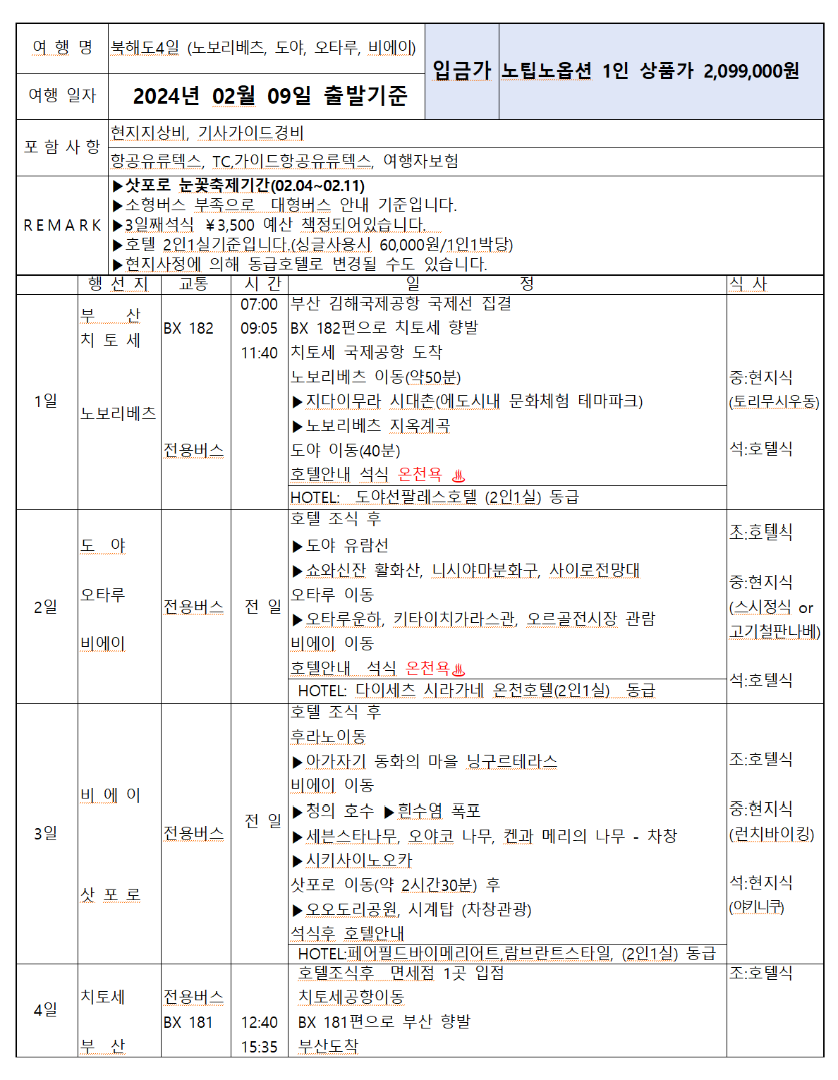 북해도 3박4일 노팁 노옵션 풀패키지