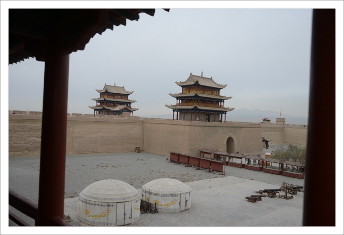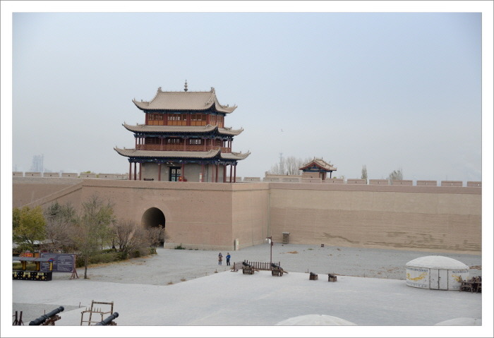 성벽 위에 올라 본 모습. 이 성은 명나라 때 축조한 것이다. 안쪽에는 주둔군들이 묵을 숙소인 파오 같은 것이 있고, 대포인 홍이포도 전시되어 있었다. 광화문의 기둥 사이로 보이는 곳은 서쪽의 문으로 유원문(오른쪽)과 가욕루이다. 가욕루를 나서면 바로 서역, 곧 실크로드로 나가는 길이 되는 것이다.