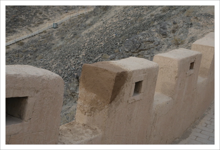 성가퀴 사이로는 우리가 올라온 곳이 내려다보였다. 바로 아래로는 소그드인으로 생각되는 사람들의 모습을 한 낙타 대상이 보이고, 그보다 보금 멀리 자세히 보지 않으면 잘 알 수 없는 석각군이 보인다.