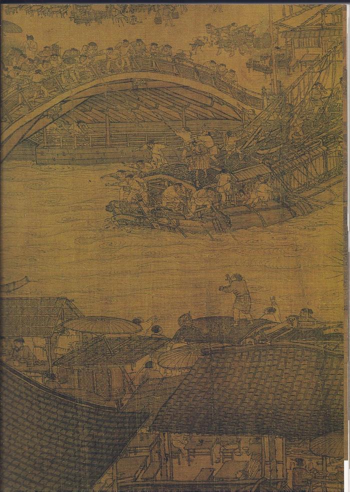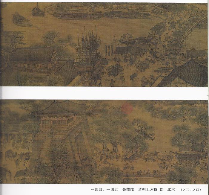 가운데 단은 변하 양쪽 강 언덕의 경관. 특히 무지개 다리 부근의 조운, 수레. 배. 시끌벅적한 시장과 사람들의 활동을 그렸다.