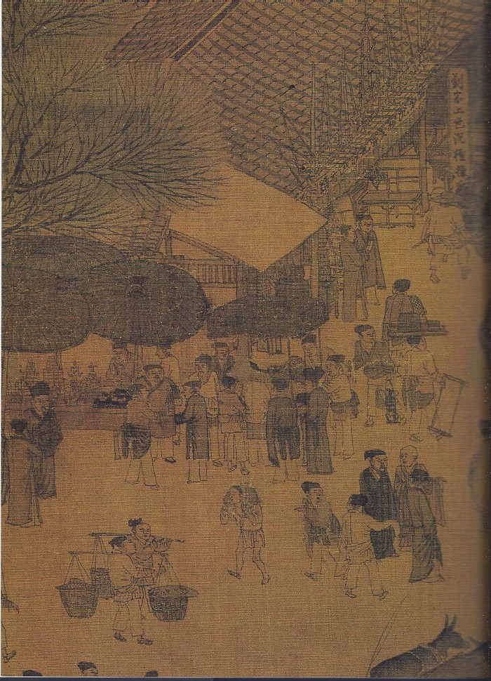 뒷단에는 시내의 번화한 장면을 그렸다. 다방, 술집, 작은 여인숙, 사관(寺觀) 등을 그렸다. 사공농상의 각계의 사람을 그렸다.