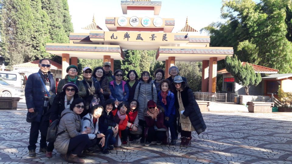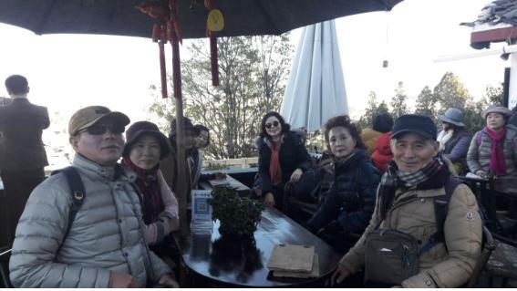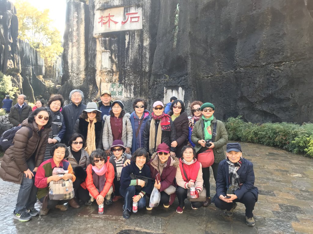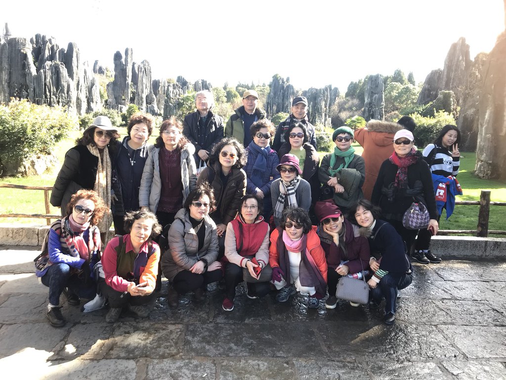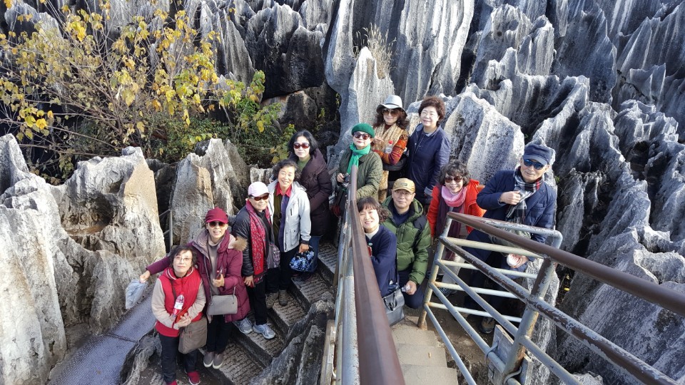 손은경 반장이 대표로 예쁜 옷을 사서 입고는 서둘러 버스에 올라 국내선 전용 공항인 홍치아오공항으로 이동하였다. 밤 11시에 동방항공 국내선에 몸을 싣고 사계절 봄의 도시인 곤명으로 날아갔다. 곤명공항에 도착하니 새벽 3시가 조금 넘었다. 숙소는 시내에 위치한 5성급의 ‘昆明陽光酒店’. 내일 투어 일정과 관련한 곤명 현지 가이드와의 시간조율이 여의치 않아 6시에 일어나서 아침 식사를 하고 7시 30분에 석림(石林) 투어를 시작하기로 하였기에 잘 수 있는 시간은 고작 세 시간 남짓. 이렇게 좋은 시설의 호텔에서 겨우 세 시간밖에 잘 수 없는데다 수면 부족으로 지친 몸을 이끌고 다음날의 여행 스케줄을 제대로 소화해낼 수 있을까라는 걱정까지 보태지니 내내 제대로 잠을 이룰 수 없었다. 무거운 몸을 일으켜 아침을 먹고 7시 반경에 2시간 반 거리의 석림으로 향하는 버스에 올랐다. 일행은 대부분 전날 잠을 제대로 이루지 못했기에 얼굴에는 피곤한 기색이 역력하였지만 화창하게 갠 하늘의 맑은 공기를 위안삼아 사진으로만 보았던 ‘돌 숲’의 웅장한 자태를 직접 볼 수 있다는 기대감으로 표정만큼은 그런대로 밝아 보였다. 이동하는 버스 안에서 조인숙 선생님께서 마이크를 잡고 돌아가며 간단하게 인사하는 시간을 가졌다. 작년 봄 강소성 양주(揚州) 여행 시 공히 당시반의 대표 가수임을 인정받았던 김성희 선생께서 예의 낭랑한 목소리로 한 곡조 뽑자 차안 분위기도 사뭇 화기애애해진 것 같았다. 드디어 석림(石林) 도착.
