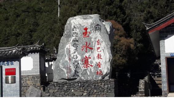 [동파교성지(東巴敎聖地) 옥수채라고 새긴 표지석. 바위의 왼편에는 그들이 지금도 사용하고 있는 동파문자가 새겨져 있다.]