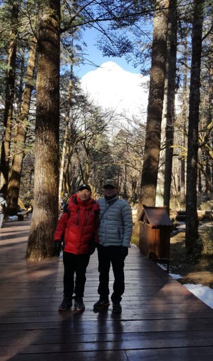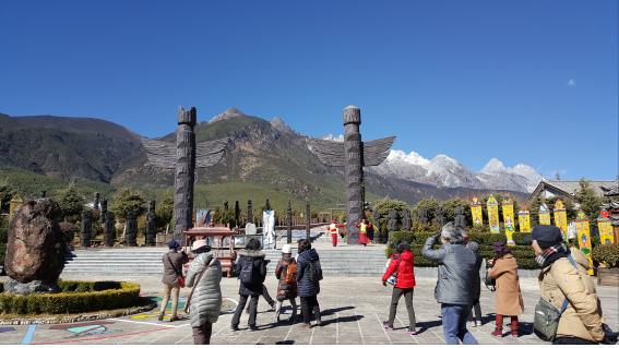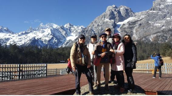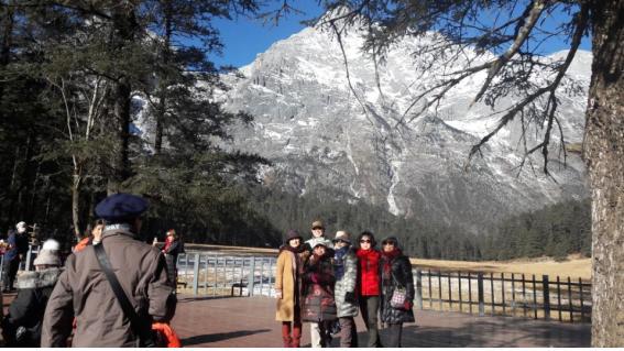 [운삼평에서 옥룡설산을 배경으로. 옥룡설산의 주봉인 편자두(扇子陡)는 인간의 발길을 허락하지 않은 처녀봉. 높아서 오르지 못하는 것이 아니라 발을 디딜 수 없을 정도로 토양이 단단하지 못한 때문이라고 한다.]