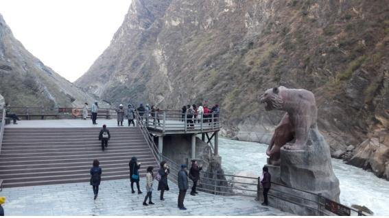 [칼바람을 맞으며 10분 넘게 계단을 내려온 우리를 반갑게 맞아주는 호도협의 호랑이 형상의 조형물. 과연 장강의 최상류답게 협곡은 좁고 물살은 거세었다.]