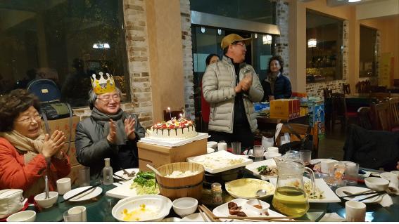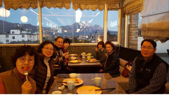 흑룡담의 외길을 따라 걸어 나오니 바로 우리가 묵고 있는 숙소와 연결된 큰 길로 이어졌다. 숙소로 들어가기 전 근처의 한 식당에 들러 저녁을 먹었다. 이날은 마침 장윤기 부이사장님의 생신인지라 어제 저녁 호텔 측에 미리 부탁하여 준비한 생일 케익을 가지고 와서 축하 노래를 부르며 케익을 자르고 와인까지 한 잔씩 돌리며 축하 분위기를 연출하였다.