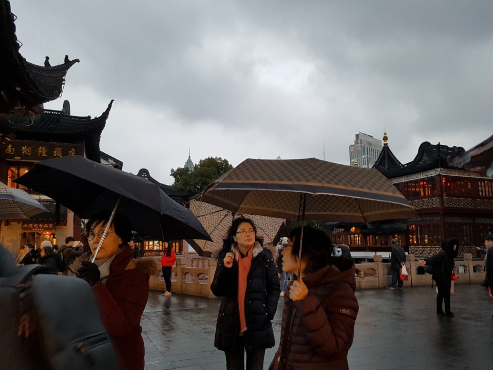 박물관 관람을 마치고 삼삼오오 우산을 쓴 채 비좁은 골목길을 뚫고 걸어서 갈 수 있는 거리에 위치한 예원(豫園)으로 향했다. 예원을 조성한 만든 사람은 명나라 때의 고관 반윤단(潘允端)으로, 그의 아버지 반은(潘恩)을 위해 만들었다고 전해진다. 예원은 ‘愉悅老親’이라는 의미가 담겨 있는데, 이는 ‘부모님을 즐겁게 해드린다’는 뜻이다. 이후 여러 번 주인이 바뀌는 부침을 겪으면서 상당 부분이 훼손되었으며, 현재의 모습은 중국정부의 복원작업으로 새롭게 다듬어진 것으로 1961년부터 일반인들에게 공개되었다. 많은 양의 비는 아니지만 계속 조금씩 내리는데다 날도 점점 저물어 어둑어둑해지고 또 홍치아오공항[虹橋空港]까지 가야할 시간이 빠듯하여 개별적으로 30분 남짓 자유 시간이 허용되었기에, 예원에 들어가서 관람하지는 못하고 그저 광장 중심가 주위에 밀집해 있는 상가를 둘러보는 것으로 만족해야만 했다.