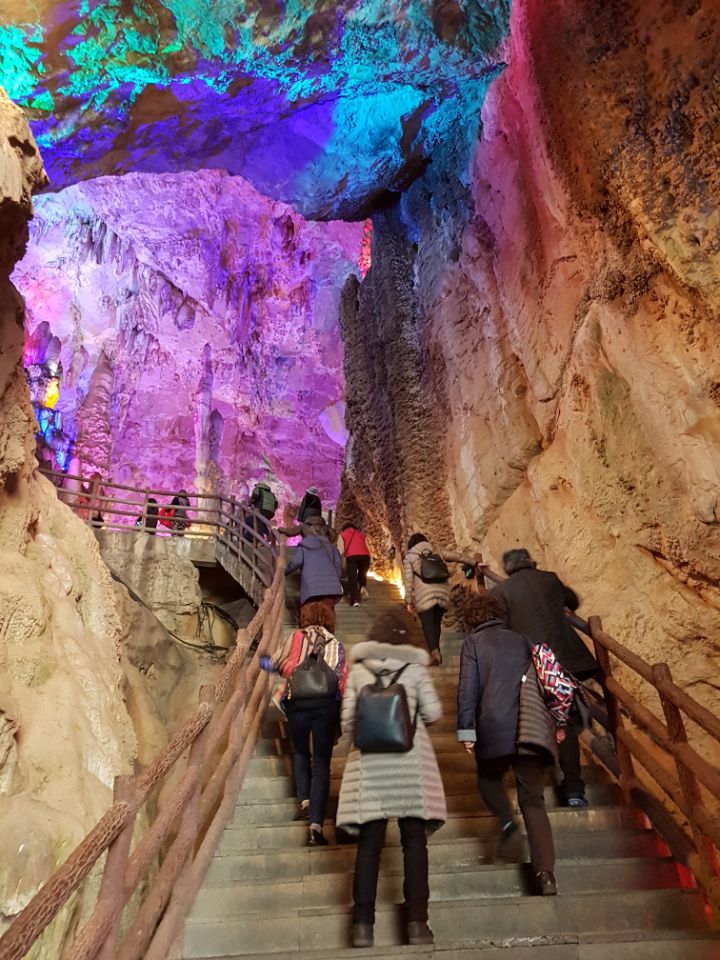 구향동굴은 1984년에 발견되었고 1994년에 국가지정 풍경명승구로 지정되었으며, 총 66개의 동굴 중 일부만 관광객에게 공개하고 있으며 관람객을 압도하는 웅장한 카르스트 지형이 매력적이다. 동굴은 협곡 구간, 동굴 구간, 로프웨이 구간으로 나뉘는데, 1km의 협곡 구간은 음취협(蔭翠峽)이라고 하며 엘리베이터를 타고 아래로 이동한 뒤 배를 이용하여 구경하는 코스이다. 그런데 애석하게도 지금은 배를 이용할 수 없는 기간이라 하여 부득이 걸어서 협곡 구간과 동굴 구간을 볼 수밖에 없었다. 동굴 구간 안에는 석순과 종유석이 가득하며 곳곳에 화려한 색채의 조명으로 눈이 부실 지경이었다. 세찬 수압으로 높이 30m에서 떨어져 내리는 자웅폭포(雌雄瀑布)와 자연적으로 형성되었다는 계단식 논 모양의 신전(神田)은 보는 이의 탄성을 자아낼 정도였다.