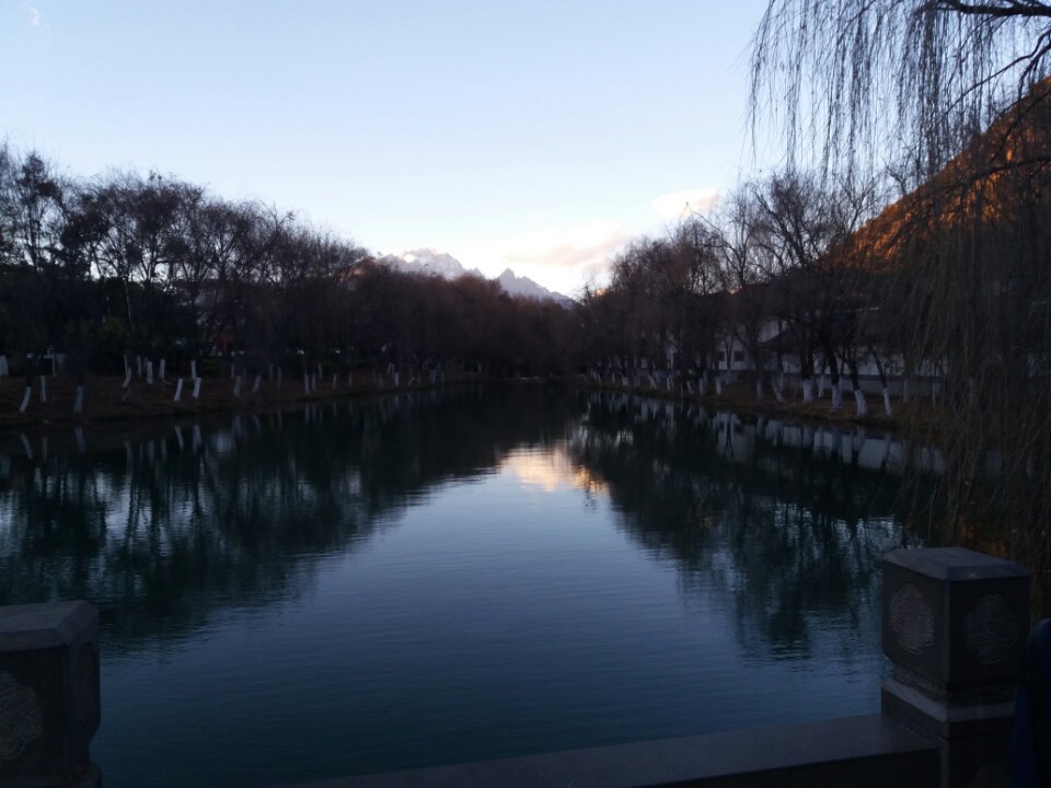 [여강고성에서 흑룡담으로 가는 도중 멀리 설산이 석양빛을 받아 냇물에 비친 모습이 한 폭의 그림처럼 아름답다.]