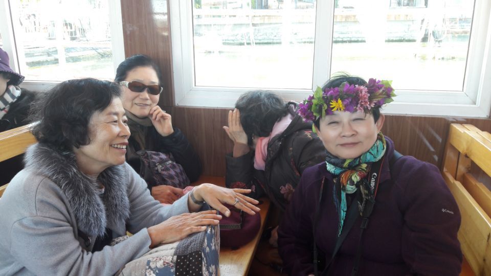 [얼하이호의 유람선을 타기 위해 선창으로 들어가는 상점가에서 무척이나 순박하게 보이는 노파의 강권에 못 이겨 김성희 선생께서 4元을 주고 산 생화로 만든 화환. 돌아가면서 한 번씩 써보고는 모두들 파인대소. 4元이 400元 이상의 웃음을 선사하였다.]