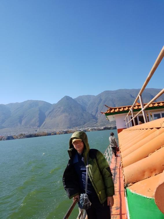 [얼하이호의 수면을 가르는 유람선 난간에서 시원한 바람을 쐬며. 비슷한 시각임에도 창산의 서편은 눈으로 덮여 있는 데 반해 동편은 그저 푸른색의 나무들로 빼곡한 게 신기하기만 하다.]