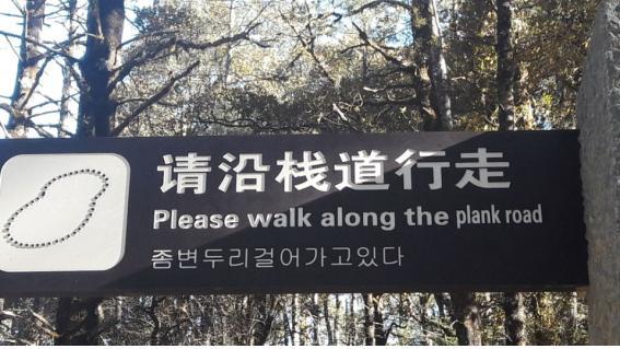 [운삼평으로 가는 연도에 설치된 표지판. “請沿棧道行走”은 “잔도―널판지길―를 따라 걸어가세요!”정도로 번역하면 될 것을 “좀변두리걸어가고있다”라고 하였으니 참으로 대략난감! 이외에도 “請勿穿越叢林”은“수풀을 넘지 마세요!”로 번역해야 할 것을 “좀물입을수록덤불임했다”라고 하니 漸入佳境!]