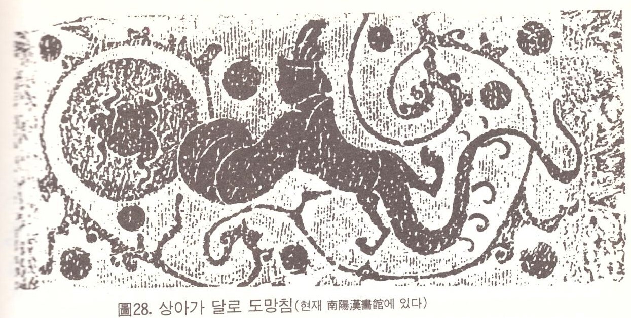 중국 한나라 때의 화상석에 복희와 여와의 후신으로 보는 상아를 표현했다. 뱀 모양의 꼬리가 있다.