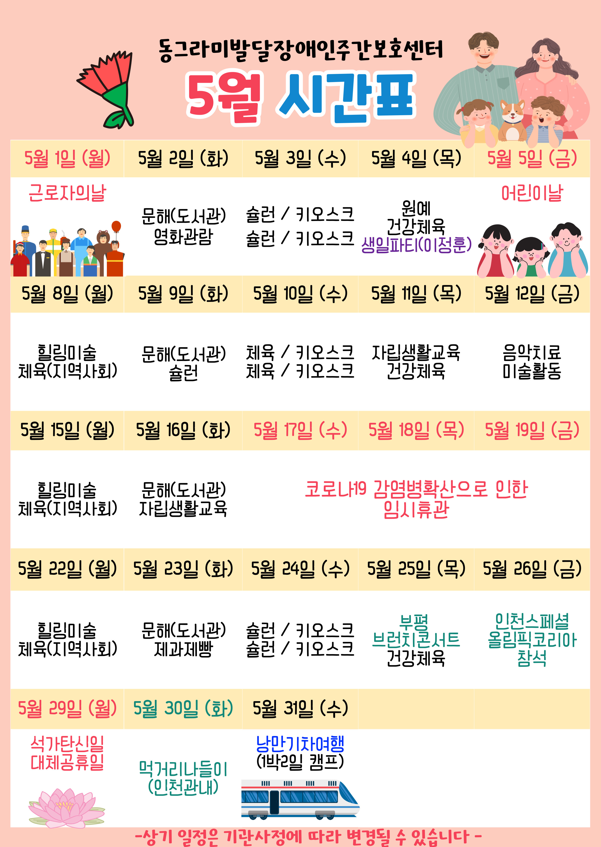 2023년 05월 월간계획표 작성자동그라미발달장애인주간보호센터|작성시간23.04.28|조회수99 목록 댓글 0 글자크기 작게가 글자크기 크게가 다음검색 현재 게시글 추가 기능 열기 북마크 공유하기 신고 센터로 신고 댓글 댓글 0 댓글쓰기 답글쓰기 댓글 리스트