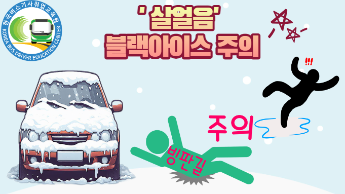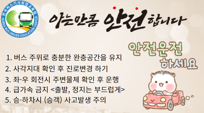 이외 특히 겨울철에는 날씨의 기온하락으로 '살얼음' 일명 '블랙아이스' 또는대설이나, 폭설로 인한 빙판길이 빈번하므로 특히나 더 주의 하셔야 합니다현재 "버스기사님" 으로 근무하시는 분들이거나, "예비 버스기사님" 들은위의 5가지 사항들을 유의하며, 지속적인 무사고 운행을저희 (주)한국버스기사 취업교육원이 한결같은 마음으로 기원합니다.