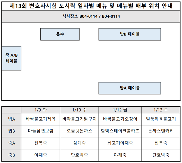 제13회 변호사시험 도시락 일자별 메뉴 및 메뉴별 배부 위치 안내 작성자14기 최재이|작성시간24.01.05|조회수217 목록 댓글 0 글자크기 작게가 글자크기 크게가 다음검색 현재 게시글 추가 기능 열기 북마크 신고 센터로 신고 댓글 댓글 0 댓글쓰기 답글쓰기 댓글 리스트