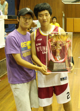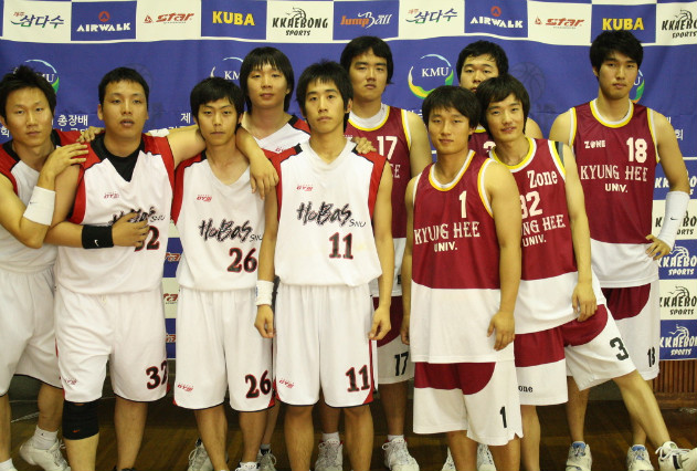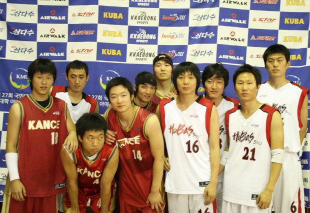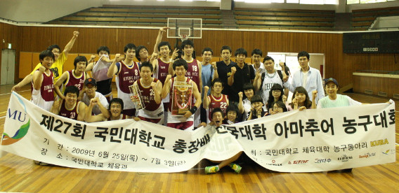 ▶대망의 결승전!!! 대회 초부터 우승후보로 예상되었던 두 팀. 결국 결승전에서 만나게 되었다. 골밑에서 우세를 보일 것으로 예상되었던 서울대는 준결승에 참석했던 26번 조강민선수가 결승전에는 모습을 보이지 않아 골밑의 위력은 한층 낮아졌지만 송수형선수가 있어 역시 건재하였다. 1쿼터 경희대 38번 홍상범선수의 3득점으로 경기는 시작되었다. 경희대는 내외곽을 넘나들며 발빠른 농구를 선보이며 경기를 이끌어 갔다. 특히 38번 홍상범선수의 3점 두 방과 속공 레이업 슛이 큰 점수 차이의 발판을 만들었다. 2쿼터 여전히 분위기는 경희대에게 있었다. 장신의 대명사인 서울대 6번 송수형선수는 경희대 수비에 묶이며 별다른 활약을 보이지 못하고 있었다. 그러나 서울대 가드 11번 송인석선수의 인터셉트 후 속공 득점으로 서서히 살아나는 듯 했으나, 외곽이 터지지 않아 고전하였다. 3쿼터 역시 장신의 6번 송수형선수!!! 골밑에서 연속 3개의 블록을 하며 흐름을 가져온 서울대! 게다가 11번 송인석선수의 인터셉트에 이은 3득점으로 역전을 하였다. 그러나 경희대 MVP! 38번 홍상범선수는 이를 내버려두지 않고 3득점으로 재역전시킨다. 이렇게 계속 엎치락 뒤치락하며 동점으로 3쿼터 마무리. 4쿼터가 되자 경희대 38번 홍상범선수와 53번 주진우선수의 연속 3득점으로 경기를 리드하는 경희대, 반면 서울대는 연이은 공격 실패로 점수 차를 좁히지 못한다. 서울대 14번 유병로선수가 꾸준한 득점을 해주며 뒤쫓으려 하지만 경희대 53번 주진우선수의 3점이 서울대의 추격을 저지하였다. 양 팀 벤치의 확연히 다른 분위기 경희대는 응원가를 부르다가 심판에게 경고도 받을 정도 였지만, 반면 서울대는 침착함과 초조함이 뒤섞인 분위기였다. 이를 뒤집기 위해 서울대는 경기 막판 3점슛을 계속해서 시도하지만, 들어가지 않고 결국 경희대는 큰 점수 차로 서울대를 물리치고 제 27회 국민대학교 총장배 전국대학 아마추어 농구대회의 우승을 차지하였다!