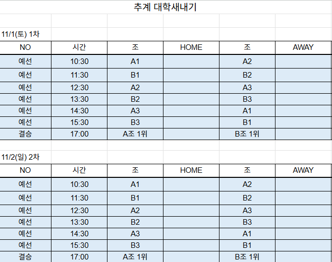 대회 방식 : 3팀 2개조 / 조별 1위간 결승전 진행(차수별로 개별 진행)