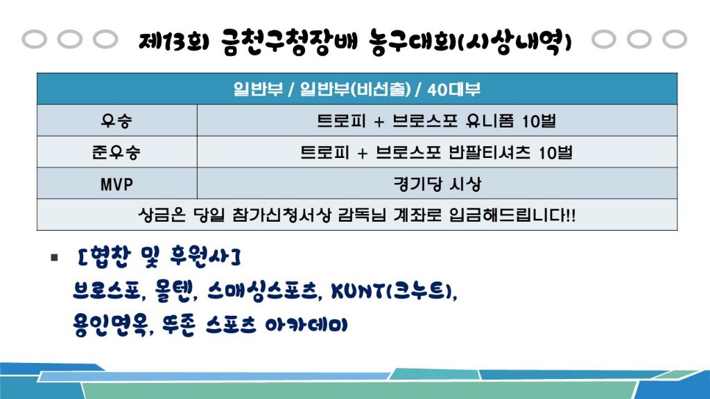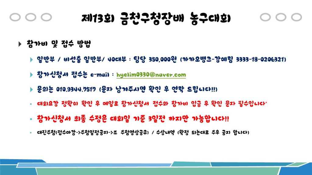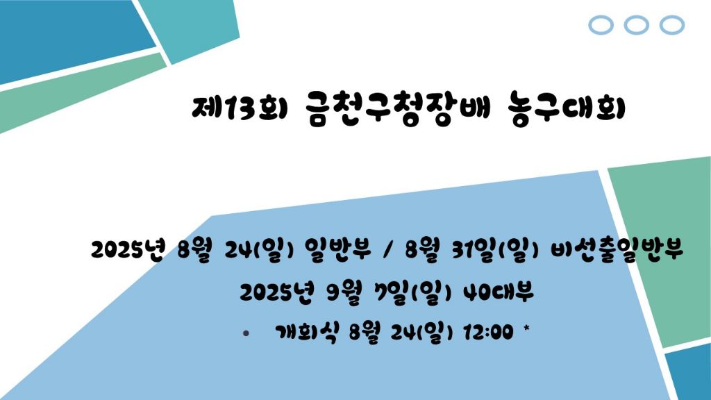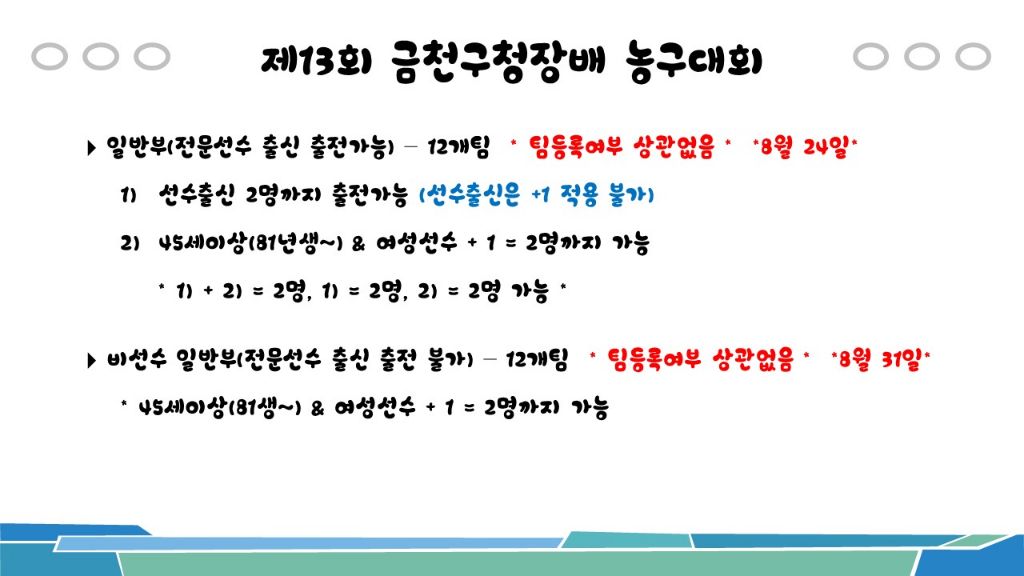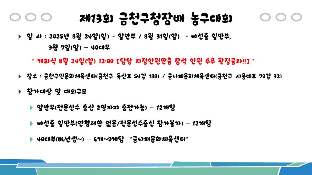 [비등록](재공지) 금천구대회 8월 24일(일) 일반부 * 4개팀 참가 신청가능* 작성자금천구농구협회-강혜림|작성시간25.07.30|조회수1,065 목록 댓글 0 글자크기 작게가 글자크기 크게가 문의는 010.9344.7517 문자주세요!! 다음검색 현재 게시글 추가 기능 열기 북마크 공유하기 신고 센터로 신고 댓글 댓글 0 댓글쓰기 답글쓰기 댓글 리스트