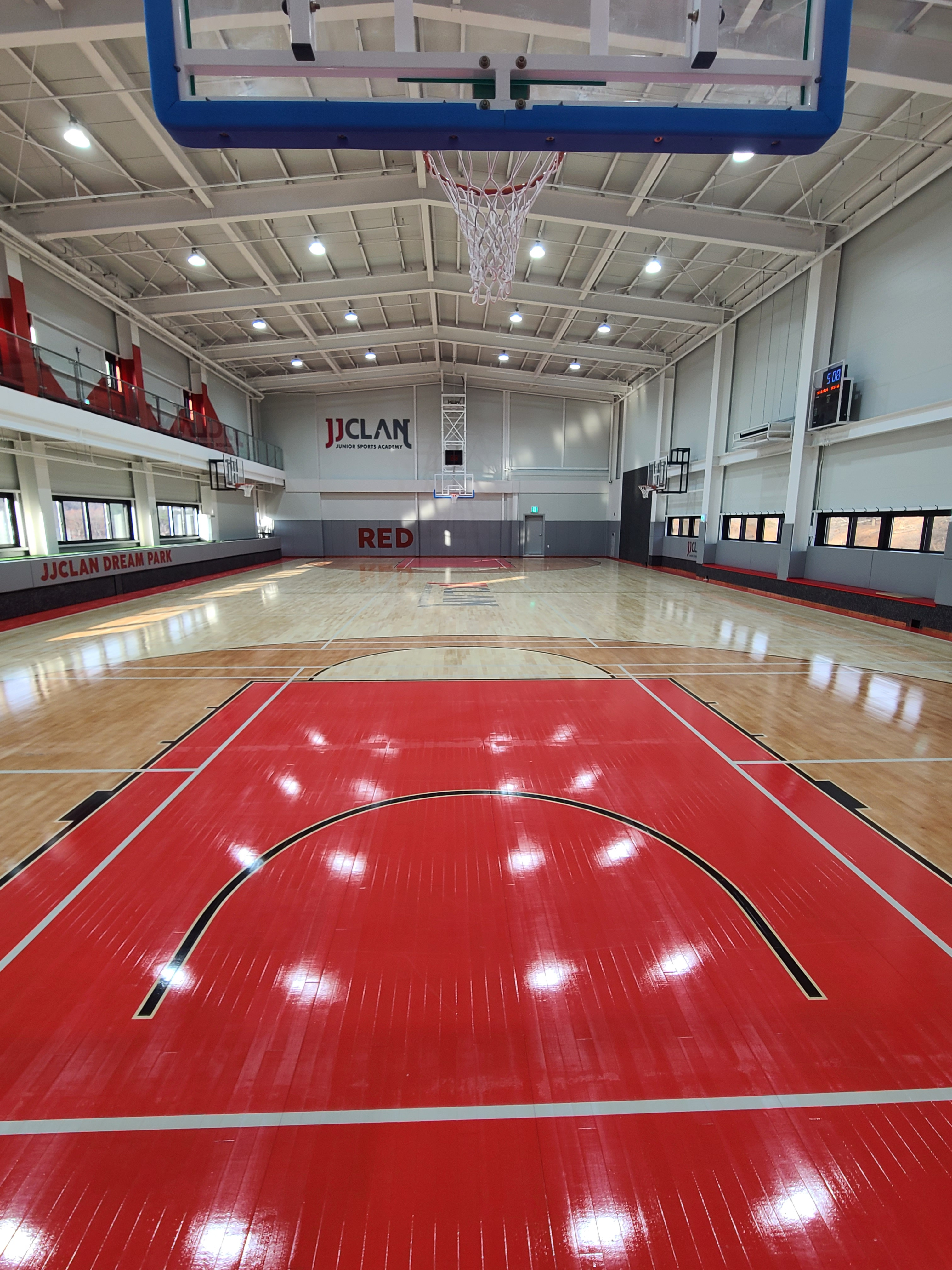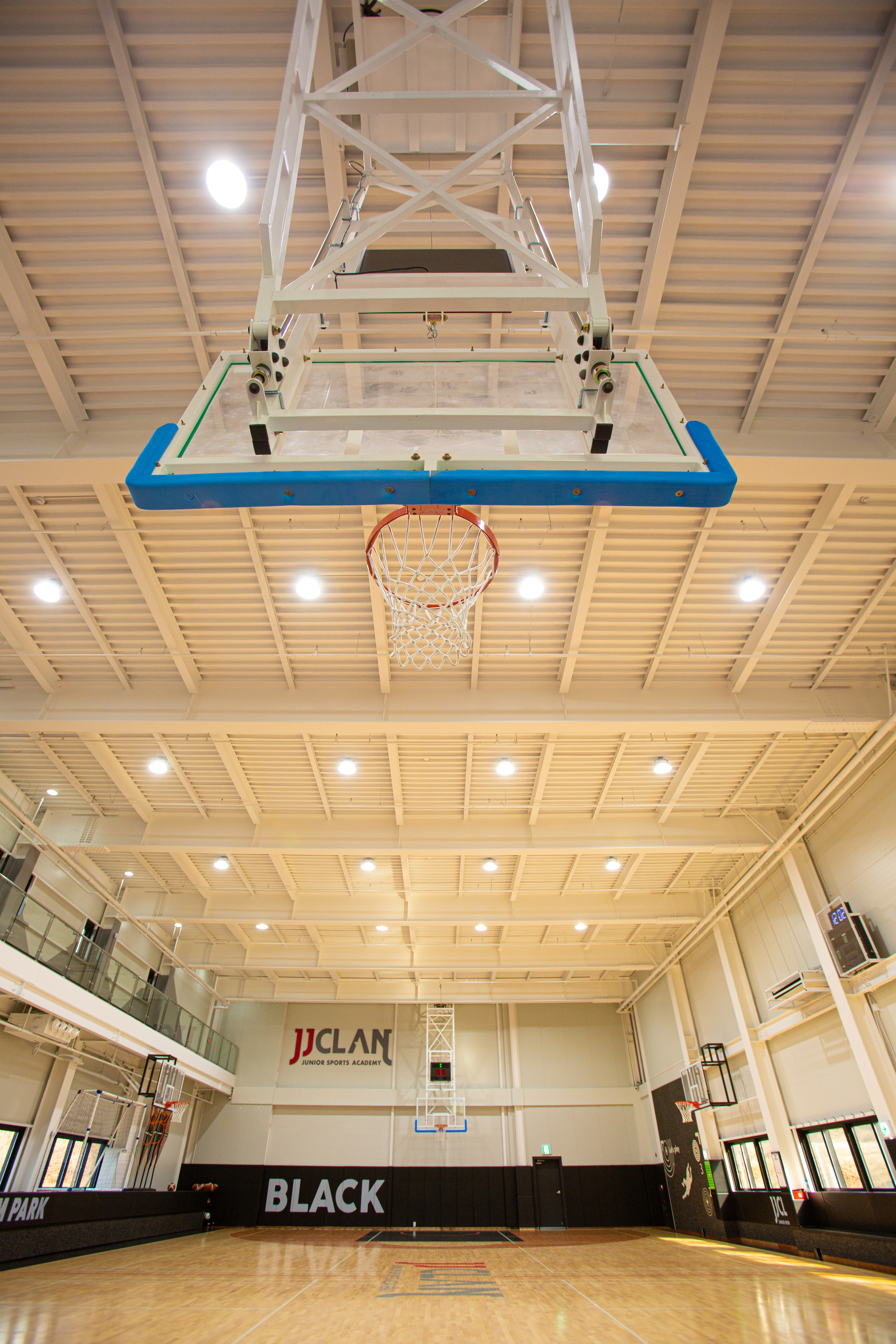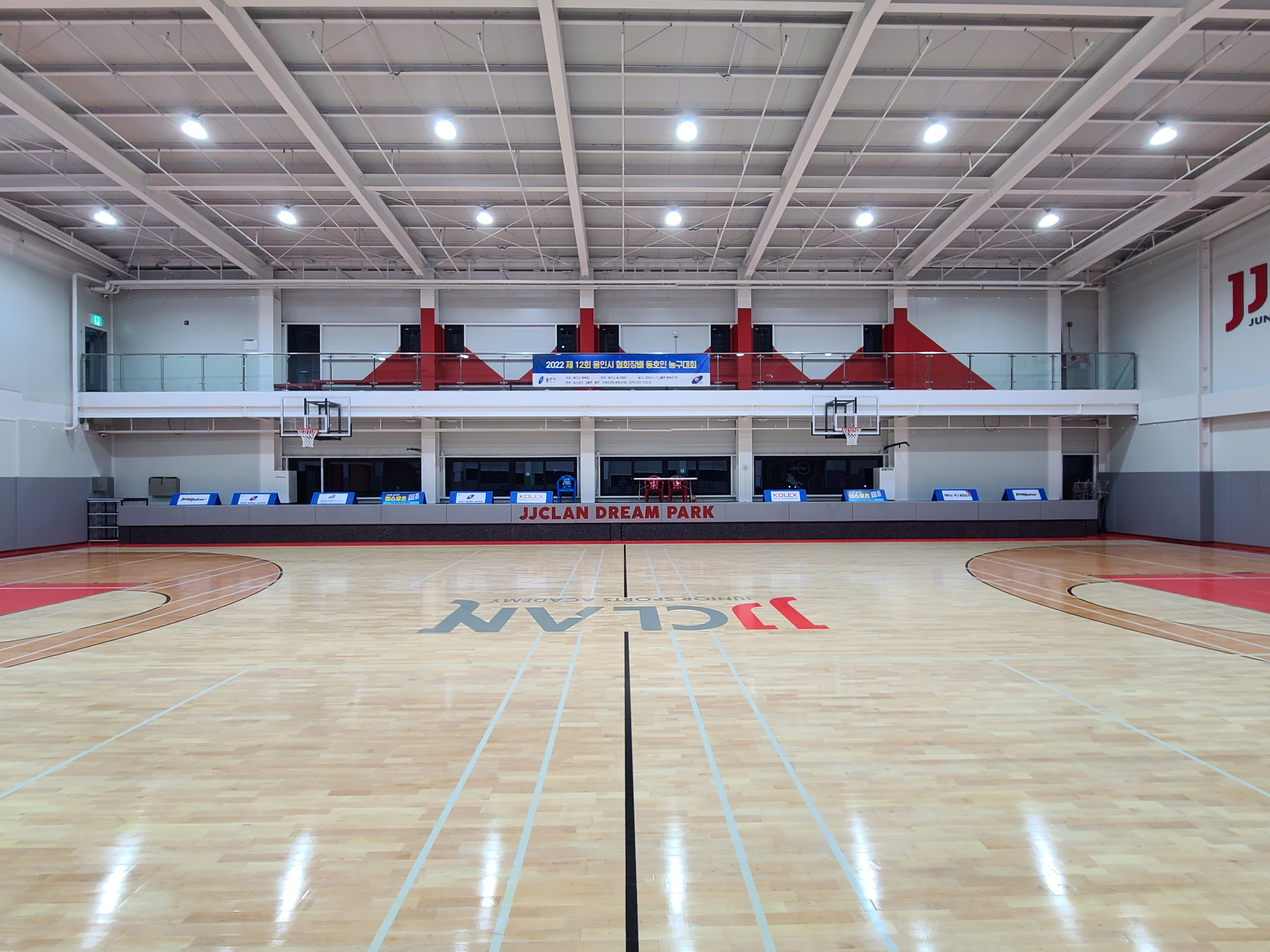 * 천장 조하식 농구 골대와 24초 전광판.스코어 전광판.