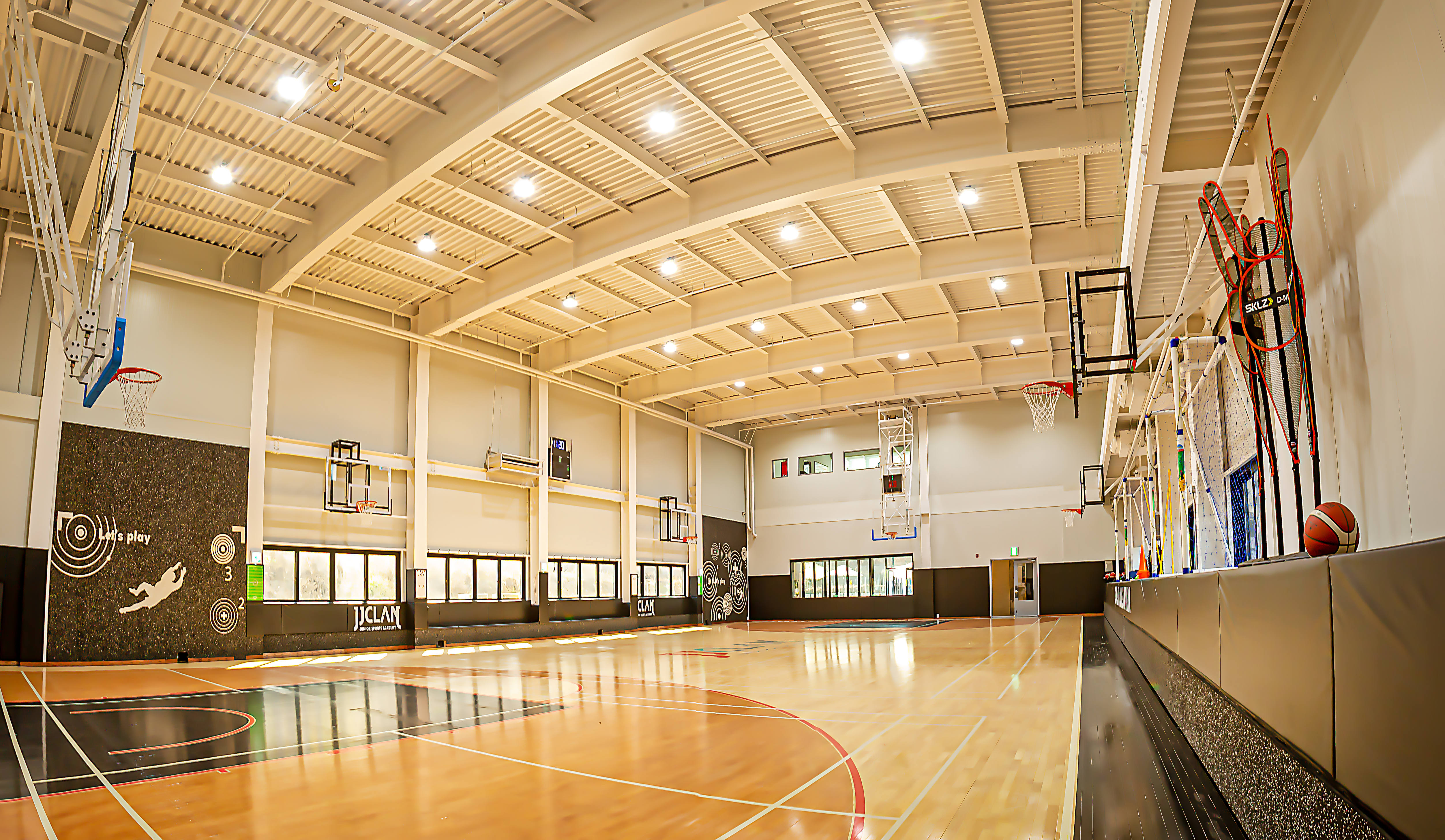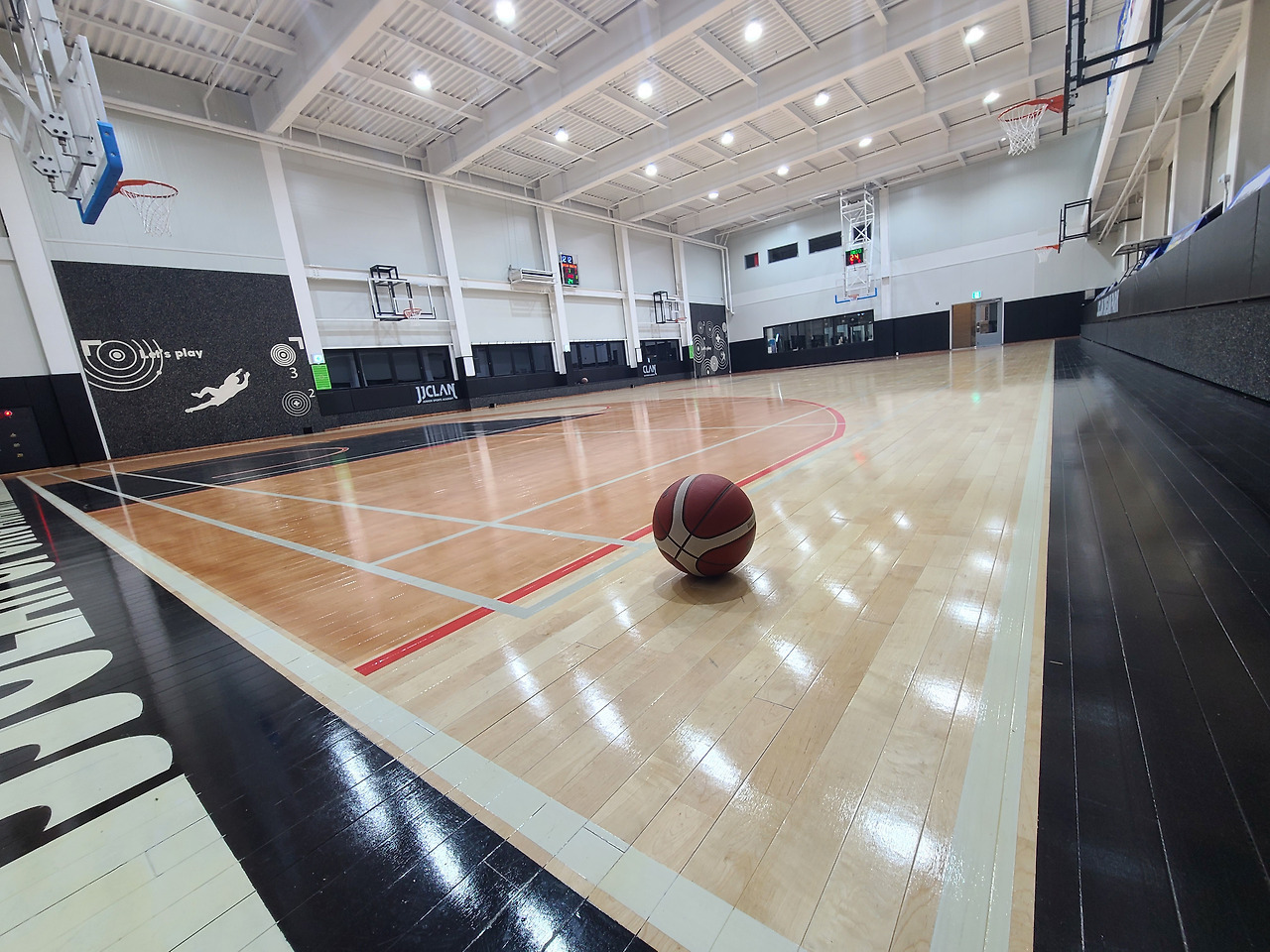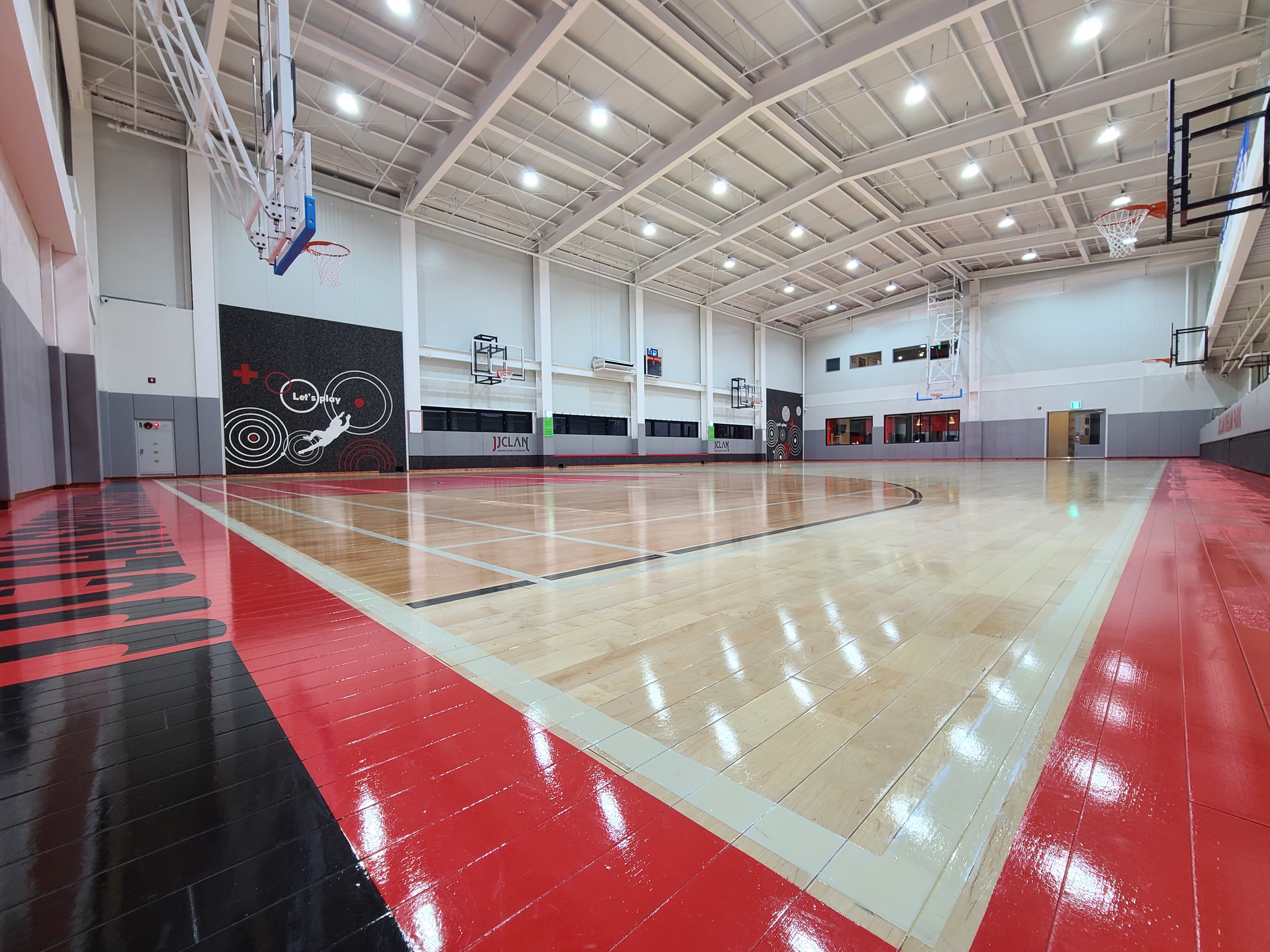 * 천장 조하식 농구 골대와 24초 전광판.스코어 전광판.