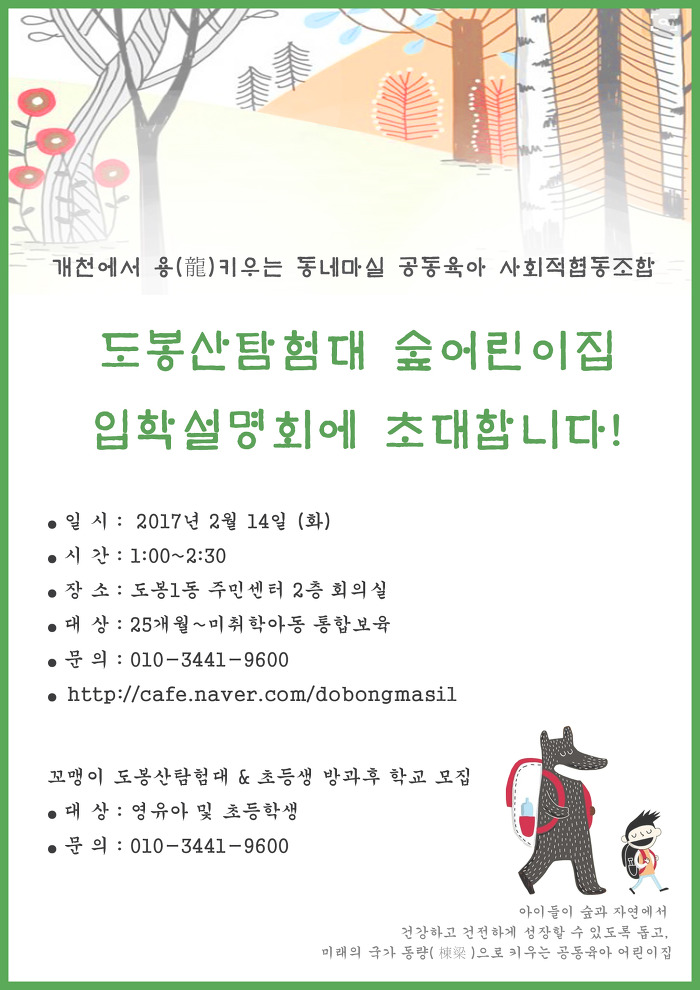 "도봉산탐험대 숲어린이집"에서 입학설명회를 개최합니다.