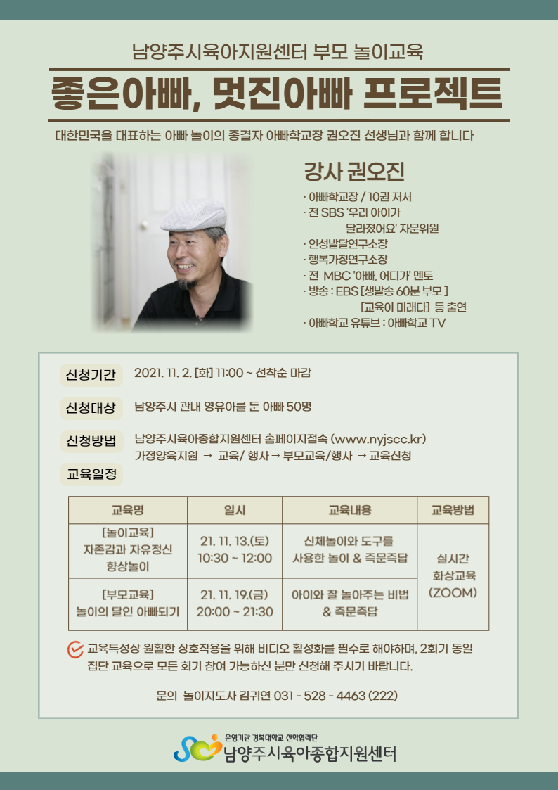 [남양주시육아종합지원센터] 아빠놀이교육 안내 작성자베이비스쿨어린이집|작성시간21.10.21|조회수83 목록 댓글 0 글자크기 작게가 글자크기 크게가 다음검색 현재 게시글 추가 기능 열기 북마크 공유하기 신고 센터로 신고 댓글 댓글 0 댓글쓰기 답글쓰기 댓글 리스트