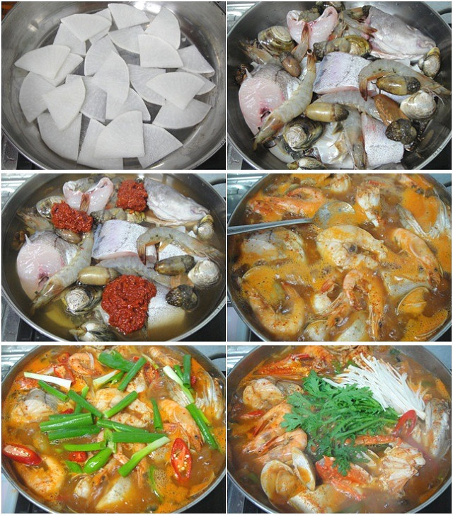 1. 각종 해물탕 요리 시, 얇게 썬 무와 콩나물을 냄비 밑바닥에 푸짐하게 깔아주세요