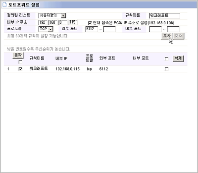 (2) [포트포워드 설정]항목에 아래와 같은 규칙을 추가해 줍니다.