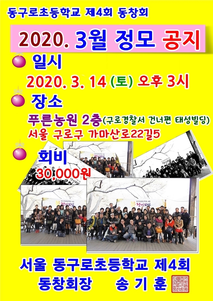 2020. 3월 서울 동구로초등학교 제4회 동창회 공지(취소) 작성자운예(김명중)|작성시간20.02.14|조회수169 목록 댓글 0 글자크기 작게가 글자크기 크게가 서울 동구로초등학교 제4회 동창회 2020. 3월 정모참석여부 댓글 바랍니다. 다음검색 현재 게시글 추가 기능 열기 북마크 공유하기 신고 센터로 신고 댓글 댓글 0 댓글쓰기 답글쓰기 댓글 리스트