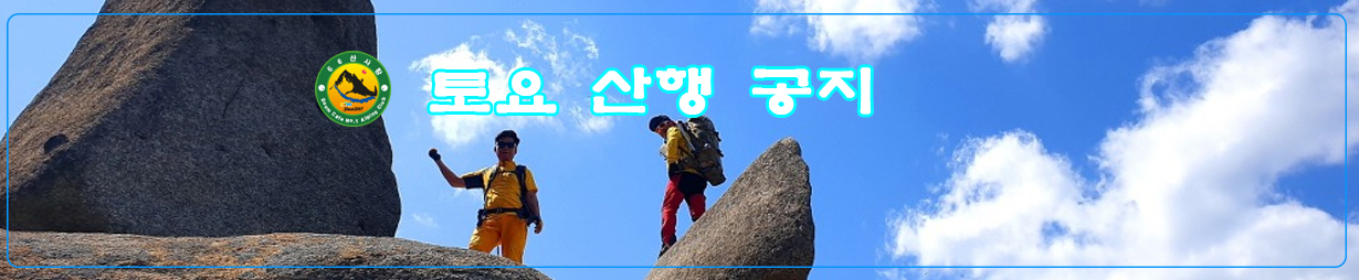 | 준비물 | . 개인상비약 . 계절 산행복장(여벌 옷, 양말 등) . 행동식(과일, 초코릿, 사탕, 떡 등), 마실 물 . 기본장비(모자, 장갑, 방수방풍의, 스틱등) - 준비 잘하세요. |