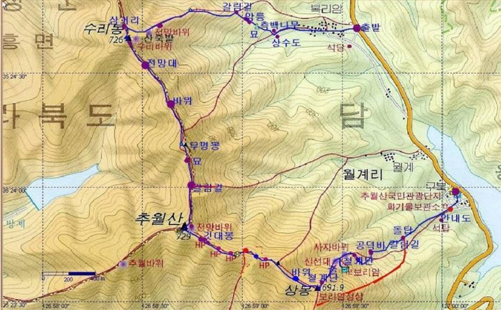 월계마을입구→복리암마을→수리봉→정상→남동릉