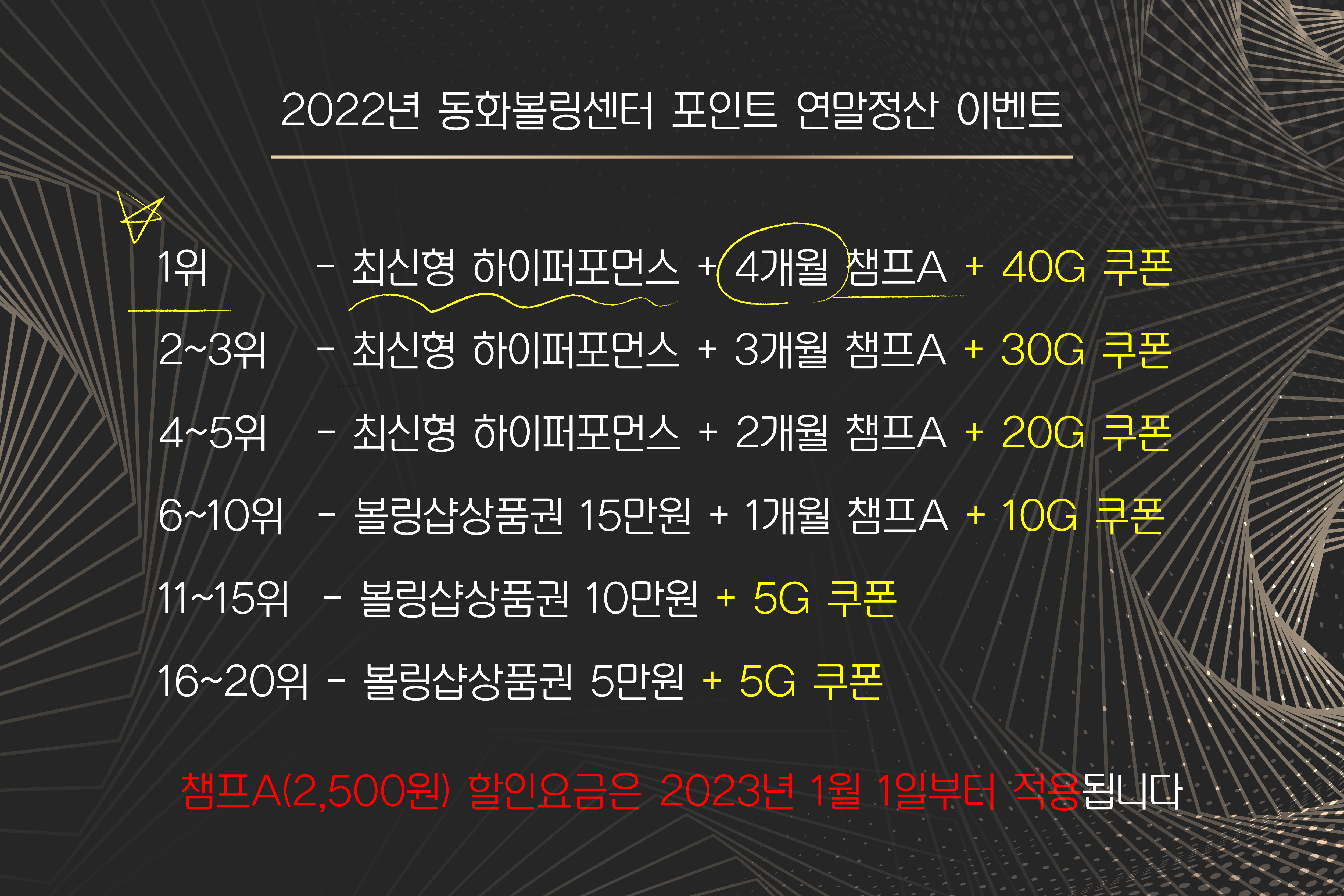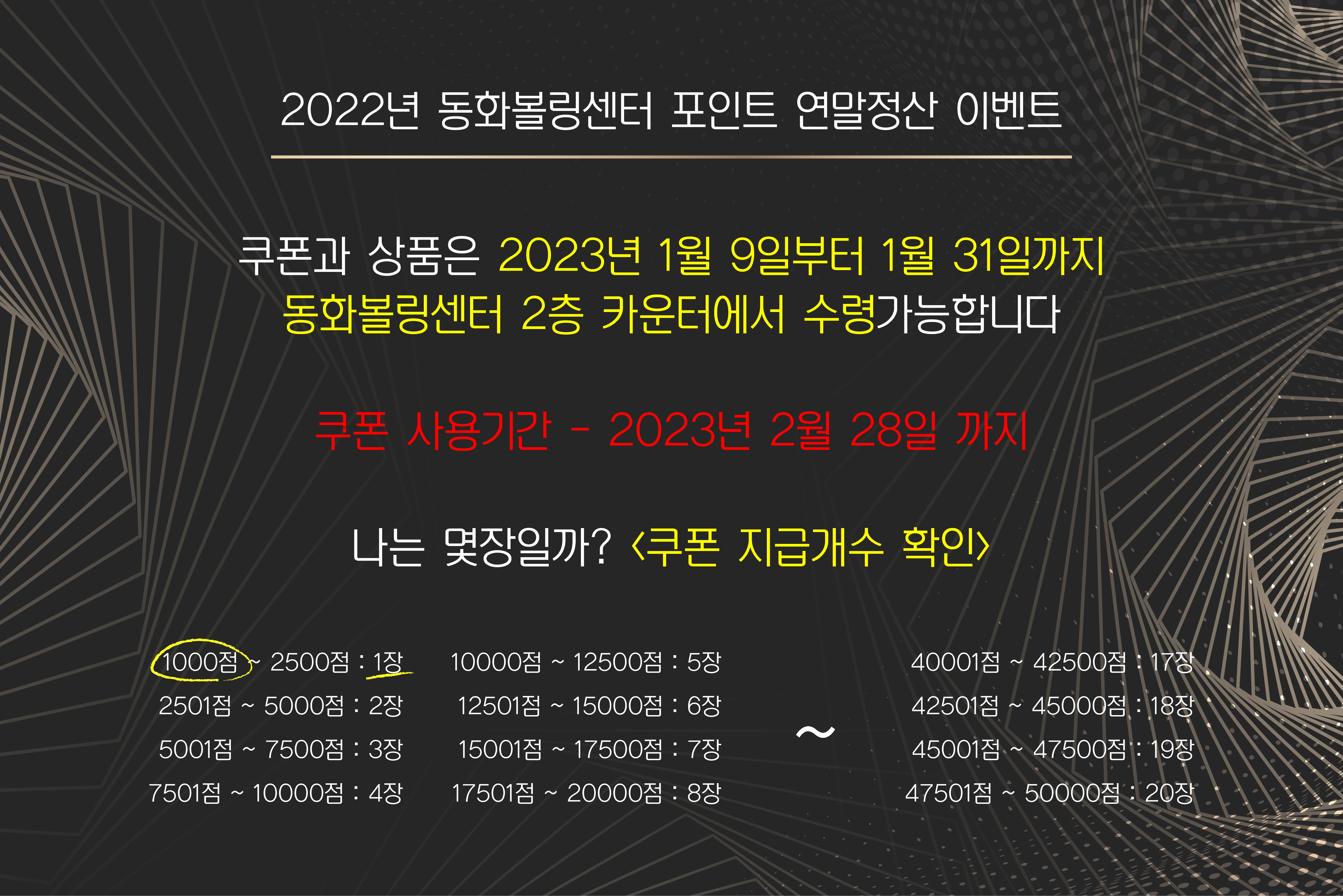 2022년 포인트 연말정산 이벤트 작성자동화볼링센터|작성시간22.12.13|조회수261 목록 댓글 3 글자크기 작게가 글자크기 크게가 올해도 어김없이 포인트 연말정산 이벤트가 다가옵니다!! 2022년 포인트 누적기간"2022년 12월 31일까지" 남은기간도 열심히 달려보아요! 다음검색 현재 게시글 추가 기능 열기 북마크 공유하기 신고 센터로 신고 댓글 댓글 3 댓글쓰기 답글쓰기 댓글 리스트 작성자플랜B 최하은 | 작성시간 22.12.14 올 한해도 수고하셨습니다 답댓글 작성자동화볼링센터-노형수 | 작성시간 22.12.14 하은님 감사합니다. 내년에도 잘 부탁드립니다. 작성자한순규 | 작성시간 22.12.15 시간이 진짜 빠르네요.벌서 마지막 달이네요.요즘 모임이 많아 볼장 출석률이 떨어지고 있네요.올한해 수고 많으셨습니다 댓글 전체보기