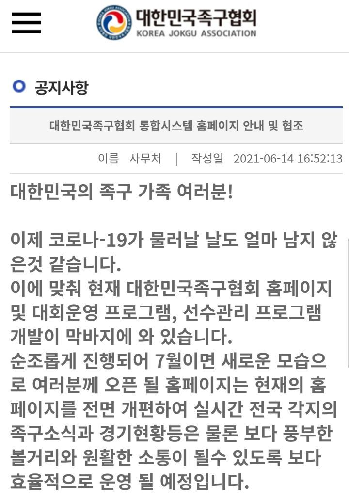 [스크랩] 대한민국족구협회 통합시스템 홈페이지 안내 및 협조 작성자장하영|작성시간21.06.18|조회수20 목록 댓글 0 글자크기 작게가 글자크기 크게가 다음검색 스크랩 원문 : ☞수원시족구협회☜ 현재 게시글 추가 기능 열기 북마크 공유하기 신고 센터로 신고 댓글 댓글 0 댓글쓰기 답글쓰기 댓글 리스트