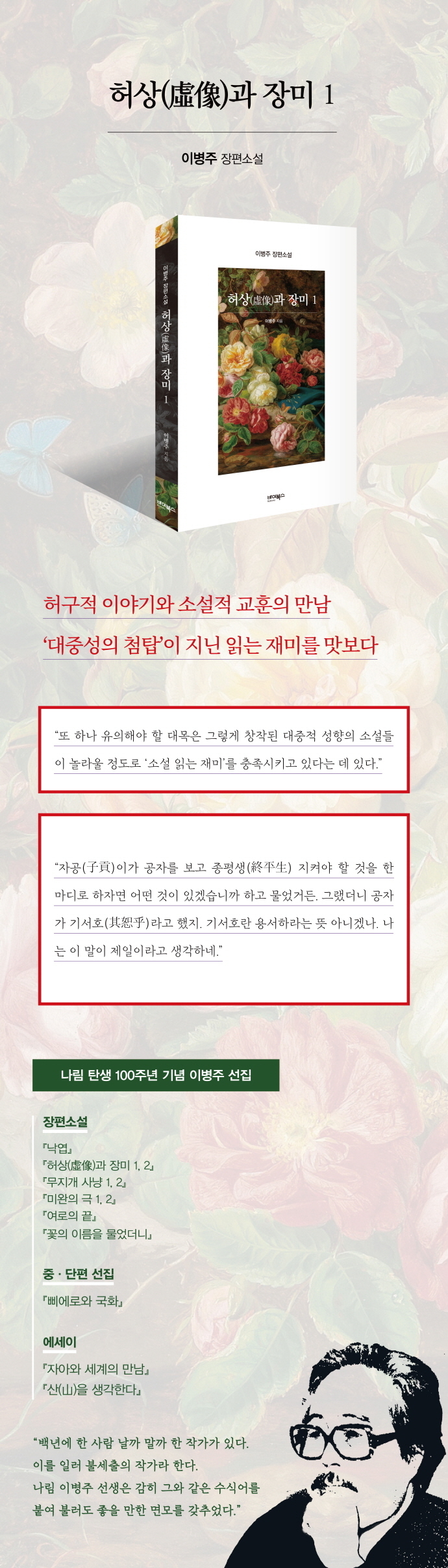 도서출판 바이북스에서 이병주 선집 12권을 펴냈다. 그 가운데 이병주 장편소설 『허상과 장미』는 ‘역사성과 대중성의 조화로운 만남’을 보여주는 작품이다. 이병주의 소설이 대중적 흥미 유발만을 과녁으로 하지 않고, 거기에 그의 특장이라 할 역사성을 결부했을 때는 더욱 그렇다. 이 모든 허구적 이야기의 조합과 심금을 울리는 소설적 교훈을 함께 공여하는 터이기에, 우리가 여기에 ‘대중성의 첨탑(尖塔)’이란 수식어를 헌정해도 무방할 것이다. 이 책은 인생이 어떻게 한 순간의 허상과 같으며 그 종막에 바치는 장미꽃의 의미가 무엇인가를 묻는다. 역사에 대한 ‘균형감각’과 ‘소설 읽는 재미’를 모두 놓치지 않는 이 소설은 이병주라는 대가의 풍모를 잘 드러내는 작품 중 하나이다.