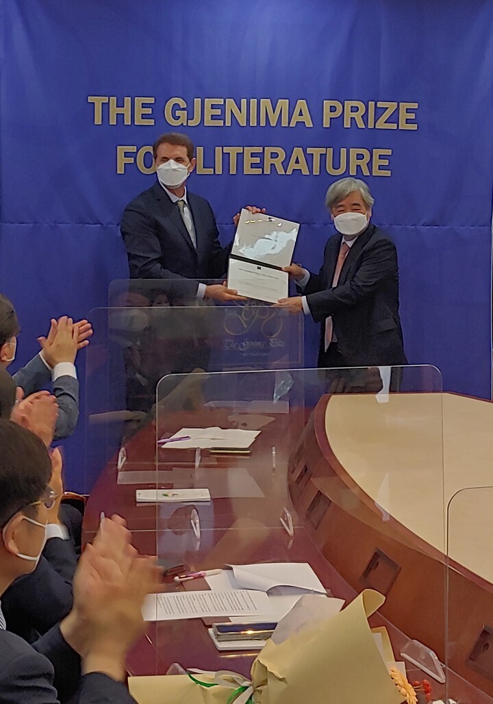 5일 고려대학교에서 열린 제18회 제니마 문학상 시상식에서 제니마 문학상 위원회 잭 마리나이 의장이 최동호 고려대 명예교수에게 상장을 수여하고 있다. (사진=㈔수원문화도시포럼 제공)