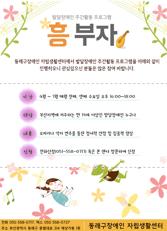 발달장애인 주간활동 지원 '흥 부자' 프로그램 안내 작성자동래구장애인자립생활센터|작성시간19.04.02|조회수70 목록 댓글 0 글자크기 작게가 글자크기 크게가 다음검색 현재 게시글 추가 기능 열기 북마크 공유하기 신고 센터로 신고 댓글 댓글 0 댓글쓰기 답글쓰기 댓글 리스트