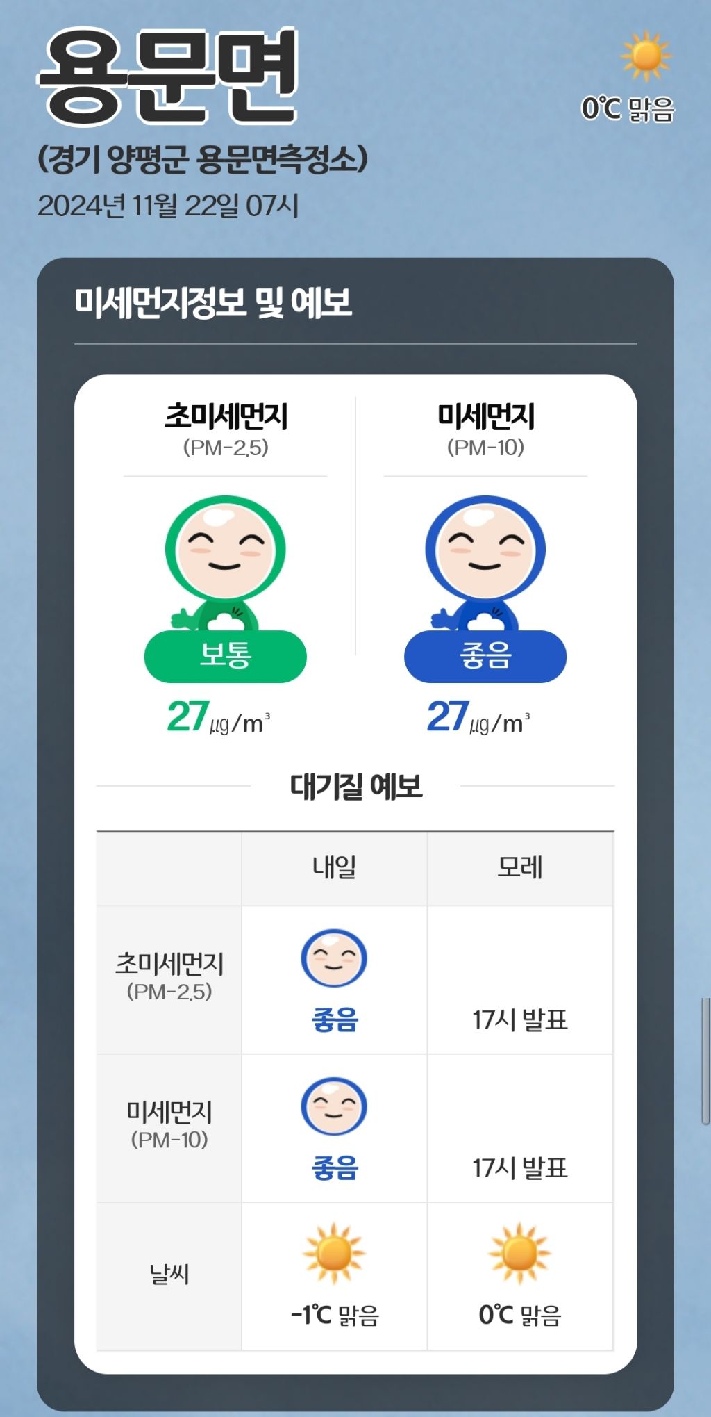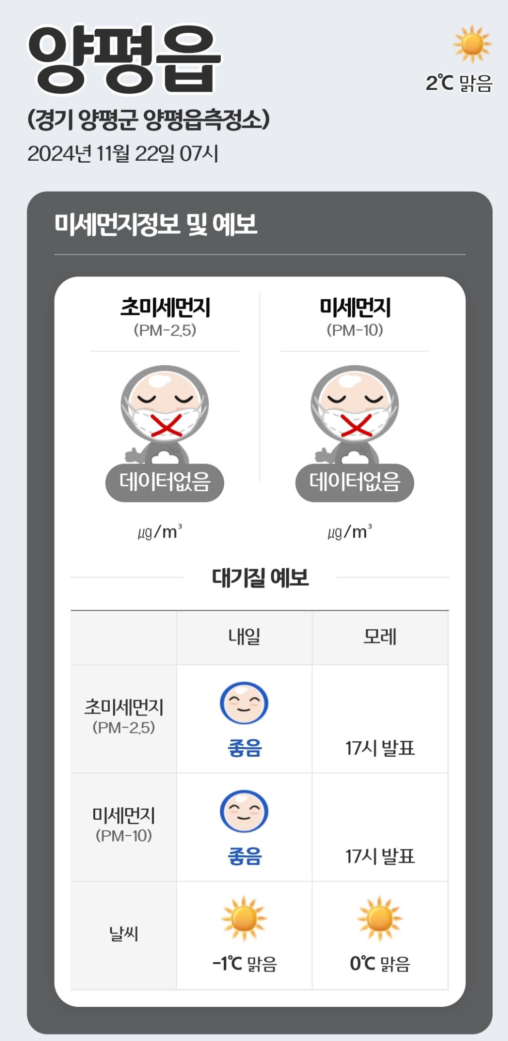 2024년 11월 22일 미세먼지 작성자24소망반T|작성시간24.11.22|조회수12 목록 댓글 0 글자크기 작게가 글자크기 크게가 *금일 양평읍측정소 데이터 오류로 인근 용문면측정소 수치 대체* 다음검색 현재 게시글 추가 기능 열기 북마크 공유하기 신고 센터로 신고 댓글 댓글 0 댓글쓰기 댓글 리스트