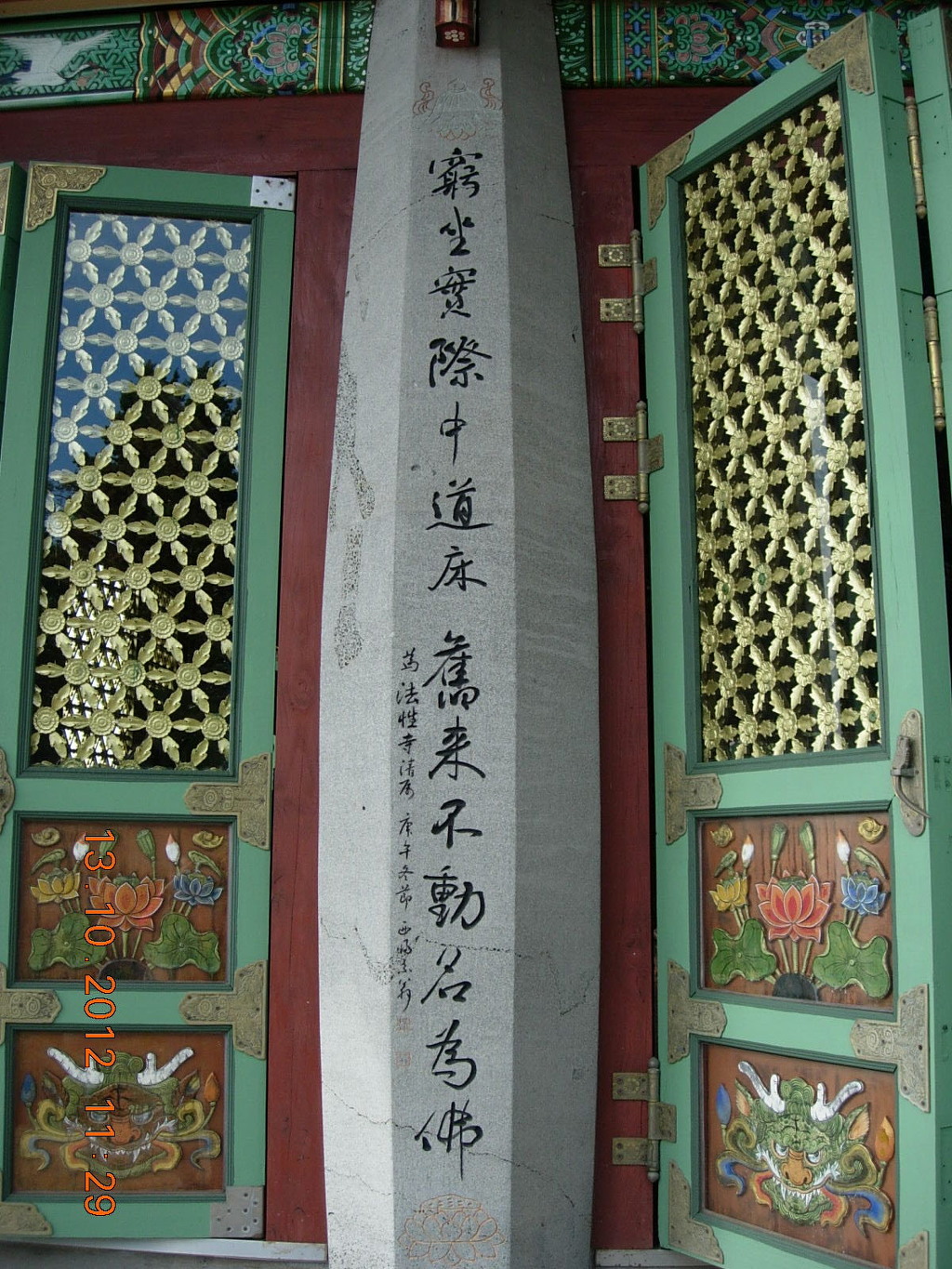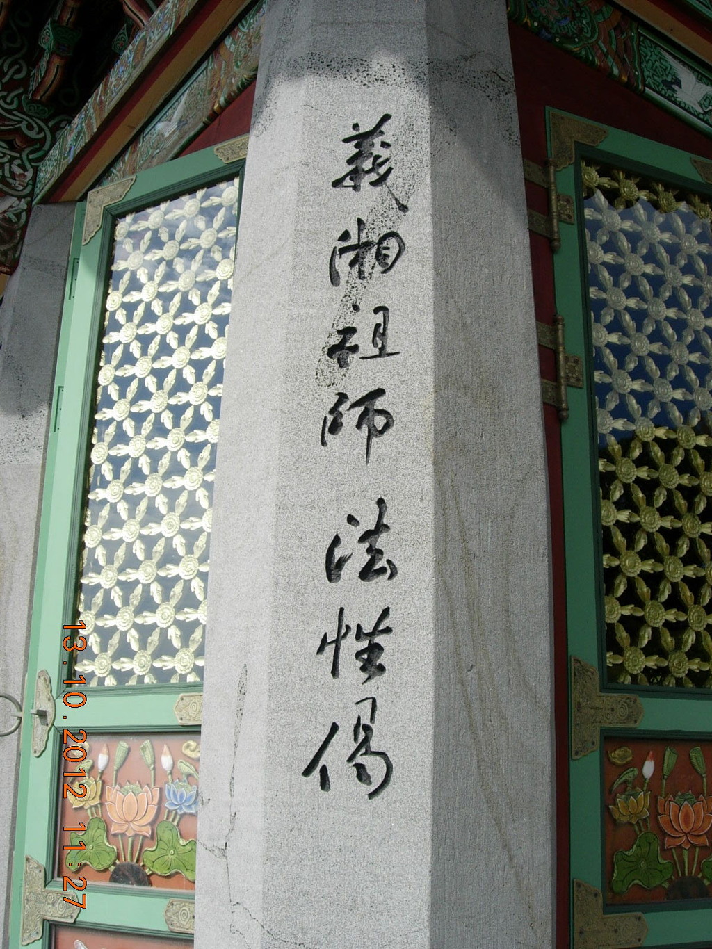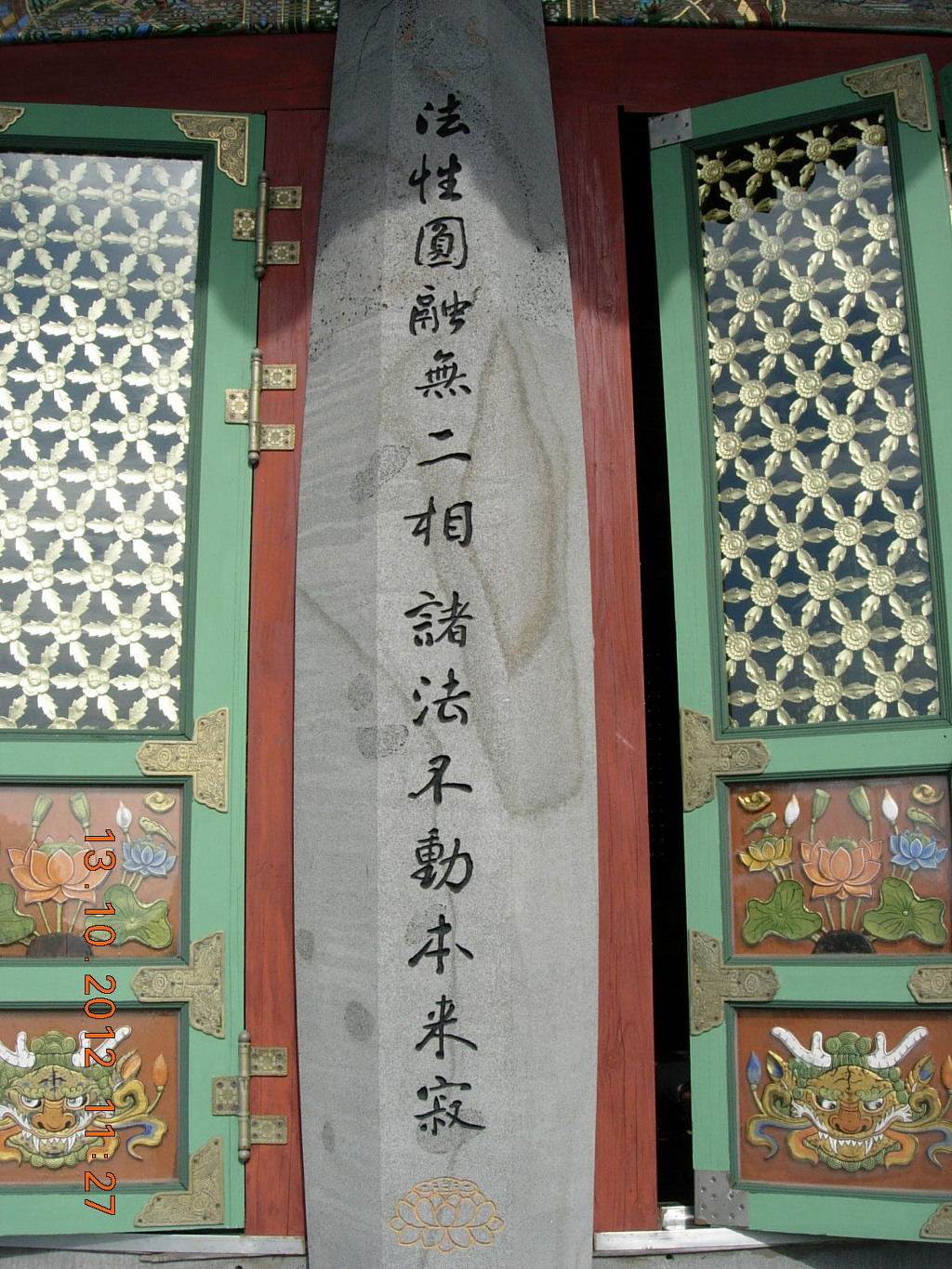 대웅전 돌기둥에는 멋진 힘찬 붓글씨로 법성게의 주련이 되어있다.