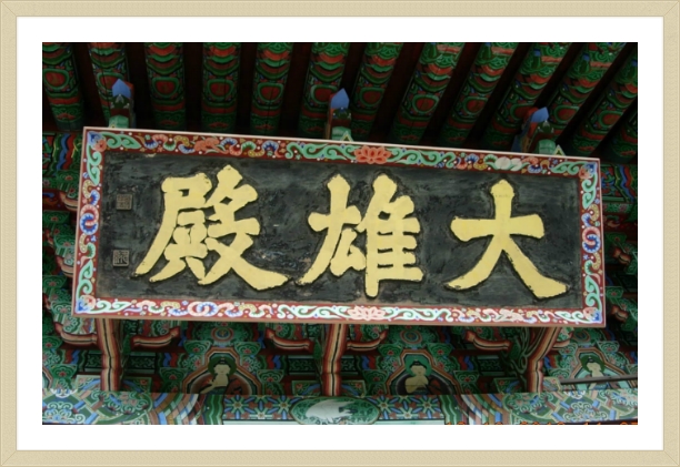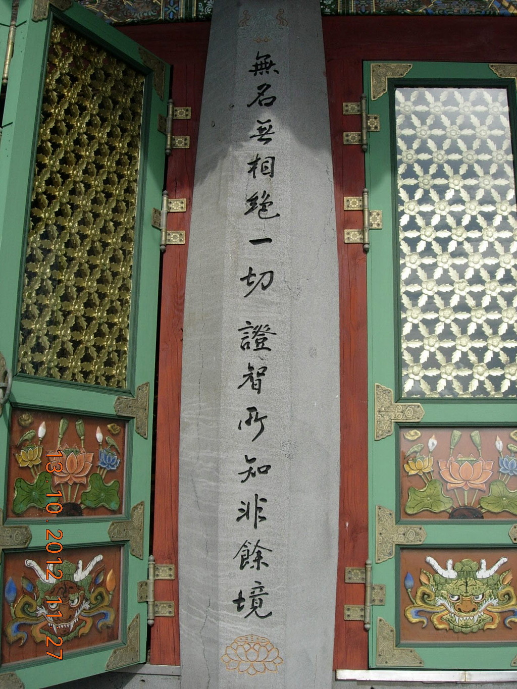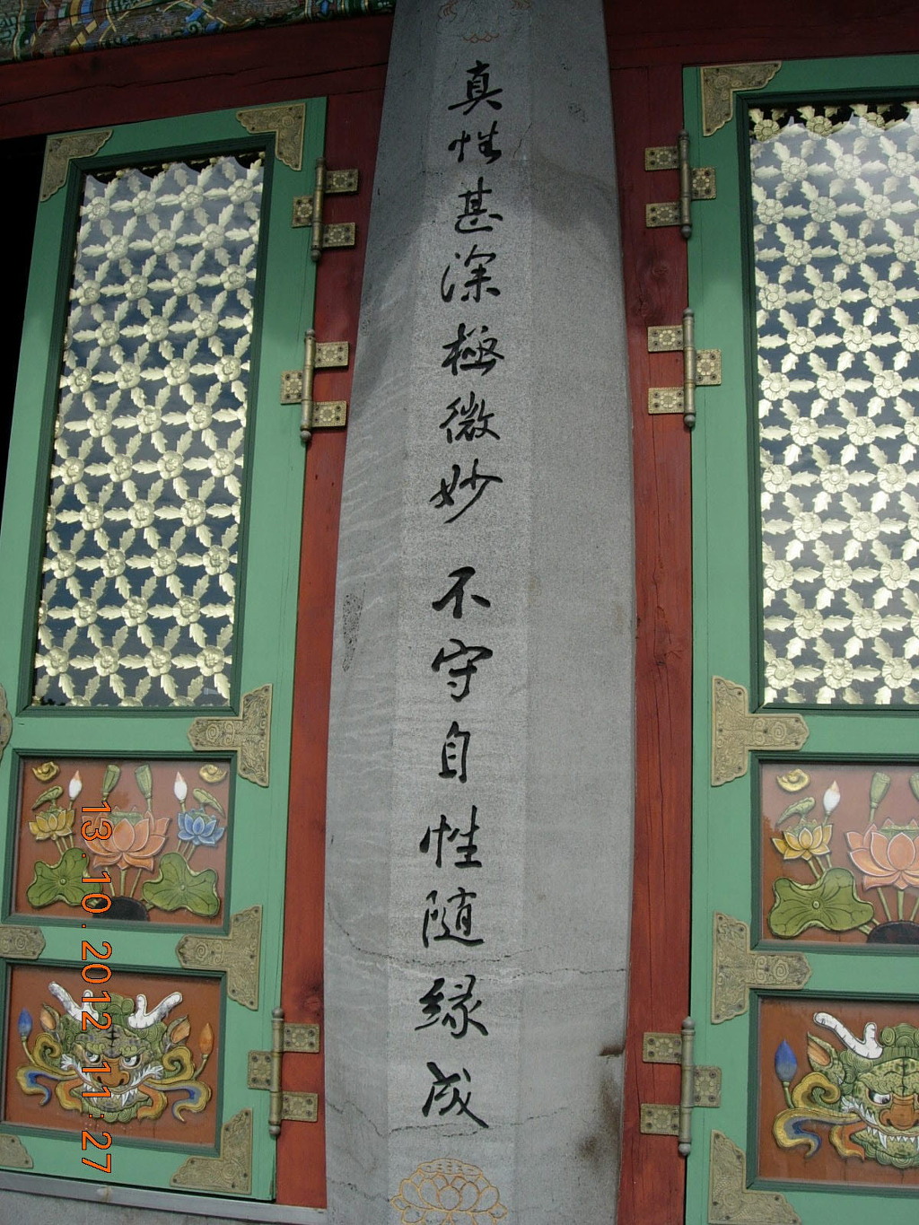 대웅전 돌기둥에는 멋진 힘찬 붓글씨로 법성게의 주련이 되어있다.