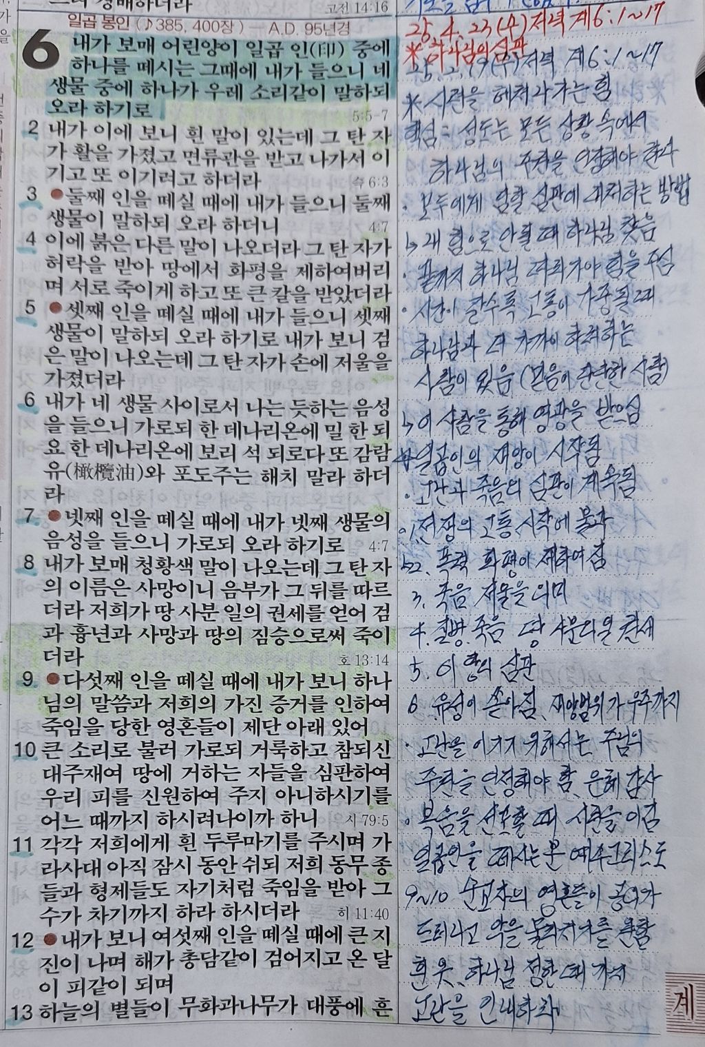 5검은말을 탄자. 저울을 가진 자. 기근을 말하며 경제적 곤란을 말합니다. 살기가 힘듭니다. 전쟁 후 기근으로 물가가 높아져 사고 싶어도 돈이 있어도 사지 못합니다. 먹을 것이 없어 천천히 말라 죽습니다. 우리는 예수님을 확실히 믿어야 합니다. 너무 두렵습니다. 믿음을 지켜야 합니다.