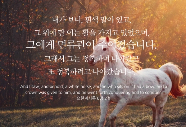 1~2 흰말을 타고 활을 가진이(예수그리스도)가 사탄과 죽음을 이기고 승리하셨습니다.