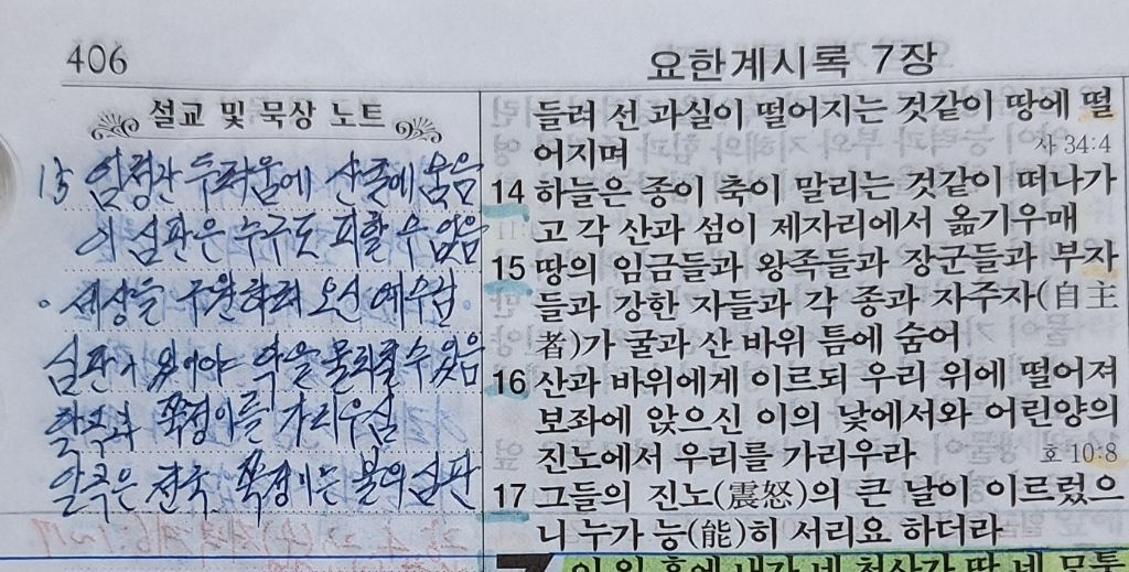 땅1/4의 권세를 얻어 검과 흉년과 사망과 땅의 짐승 등 온 인류가 당할 시련과 재난들을 목도하며 믿음을 똑바로 지켜야 합니다. 우리는 살아있을 때가 기회입니다. 하나님이 우리를 사랑해 주실 때 잘해야 합니다. 누가 어떻게 해 줄 수가 없습니다. 1대1의 신앙 입니다.