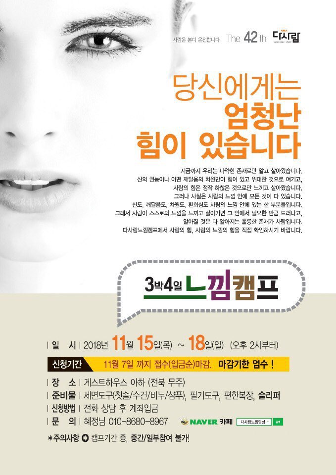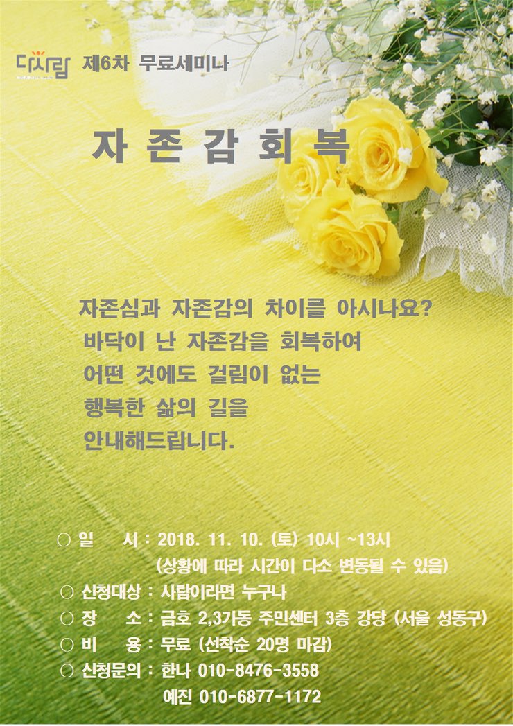 느낌캠프 및 자존감 회복에 대한 무료 세미나 안내 작성자봄날|작성시간18.11.02|조회수2 목록 댓글 0 글자크기 작게가 글자크기 크게가 다음검색 현재 게시글 추가 기능 열기 북마크 공유하기 신고 센터로 신고 댓글 댓글 0 댓글쓰기 답글쓰기 댓글 리스트